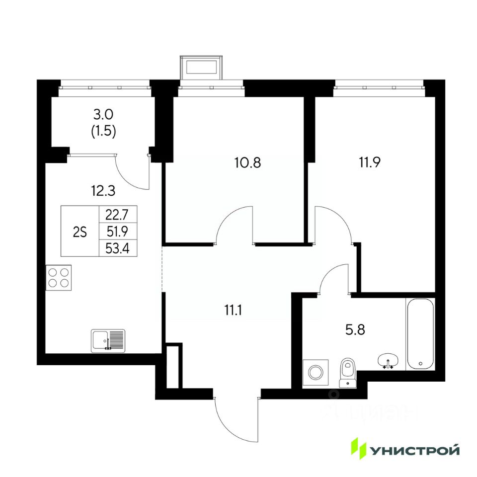 Общая площадь53,4 м2