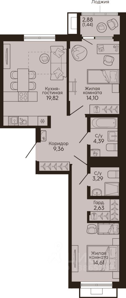 Общая площадь69,64 м2