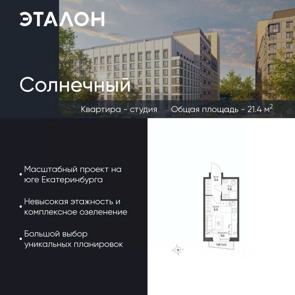 Продается квартира 142, по адресу Свердловская область, г. Екатеринбург, ул. Чемпионов, корпус Солнечный, блок 11.1 в Солнечный на 12 этаже, с площадью 21.4 м2.