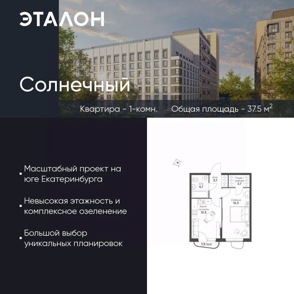 Продается квартира 161, по адресу Свердловская обл., г. Екатеринбург, ул. Счастливая, корпус Солнечный, блок 11.2 в Солнечный на 2 этаже, с площадью 37.5 м2.