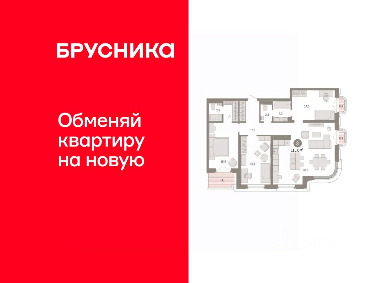 Квартира с кухней-гостиной и тремя спальнями в квартале ''На Некрасова''. Особенности планировки: балкон, второй санузел, лоджия, мастер-спальня, предчистовая отделка, разнесённые спальни. квартиры в нашей базе: НКР02-Ж2.6.4.