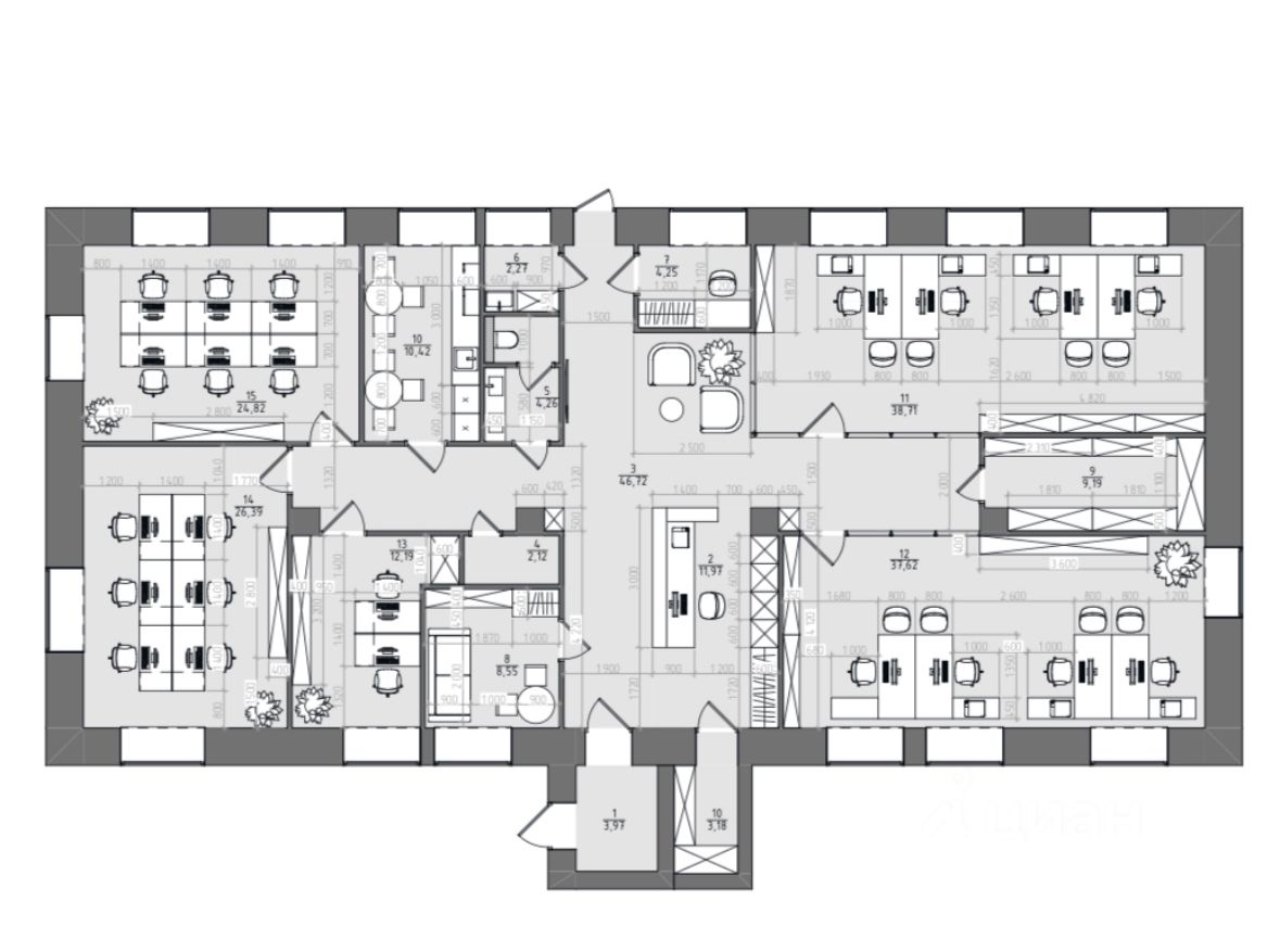 Есть офисы формата open space и кабинеты руководителя, зоны для отдыха, зоны для хранения и хозяйственные помещения.