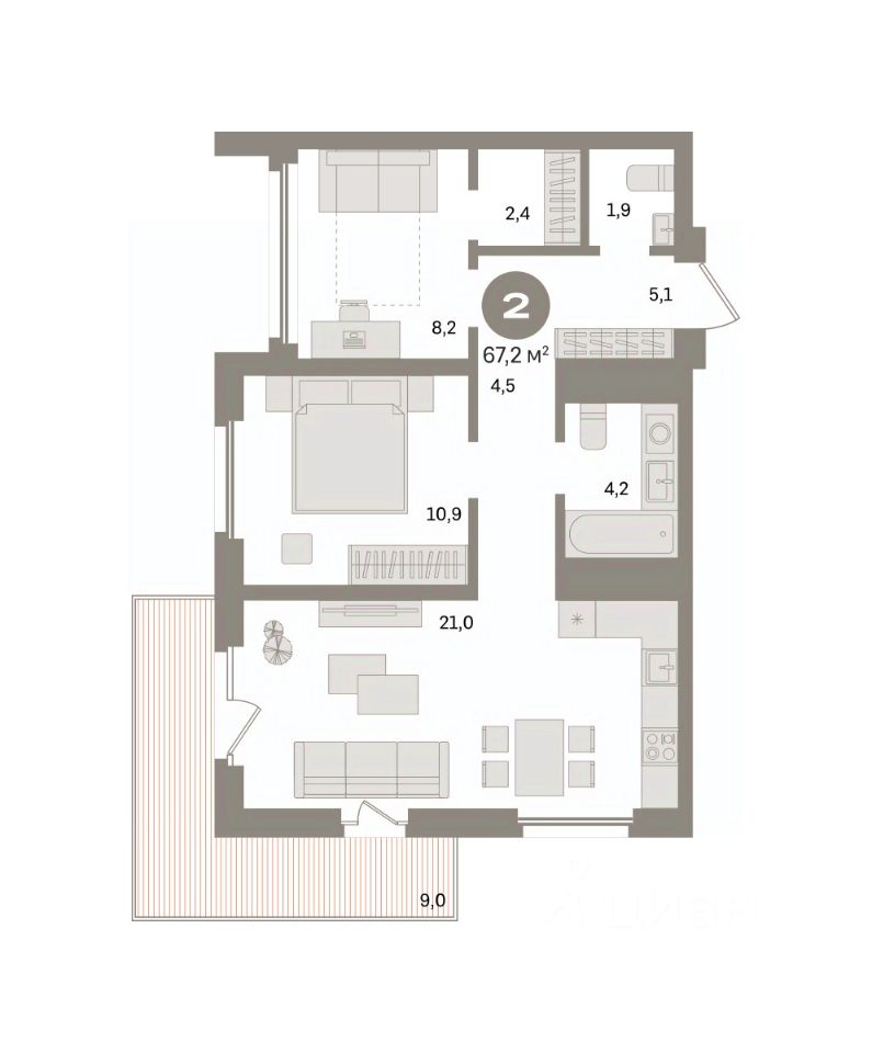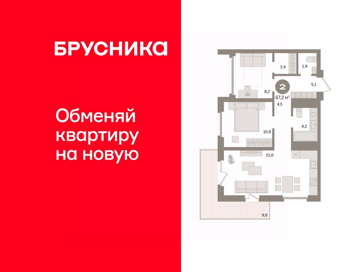 Квартира с кухней-гостиной и двумя спальнями в Южных кварталах. Особенности планировки: балкон, предчистовая отделка. квартиры в нашей базе: ЮК04-А1-9-9.5.11.
