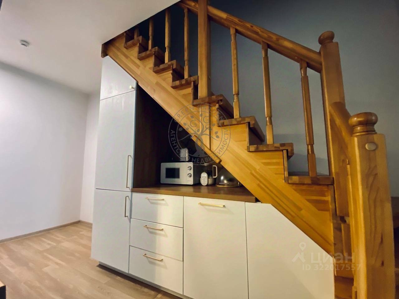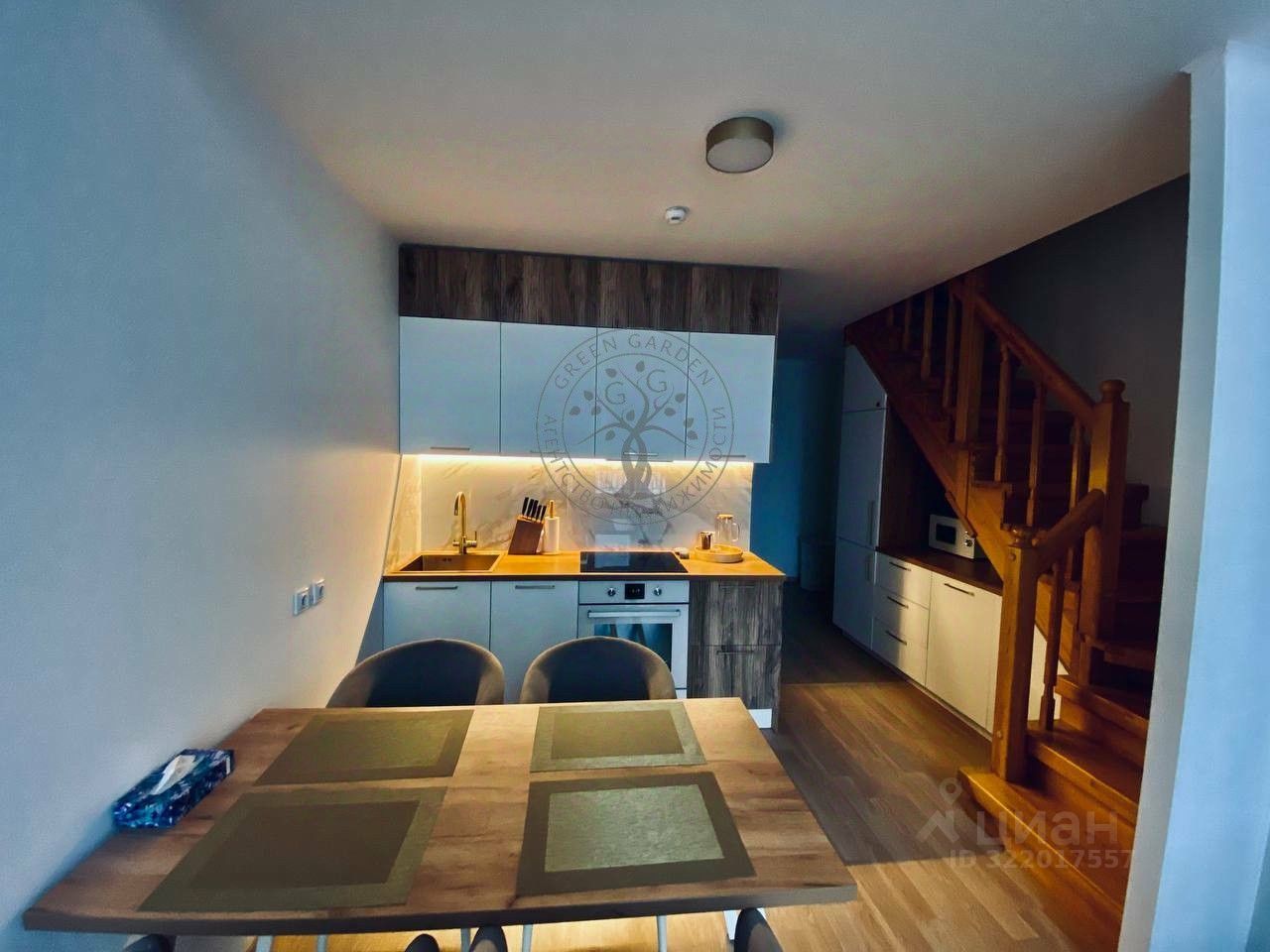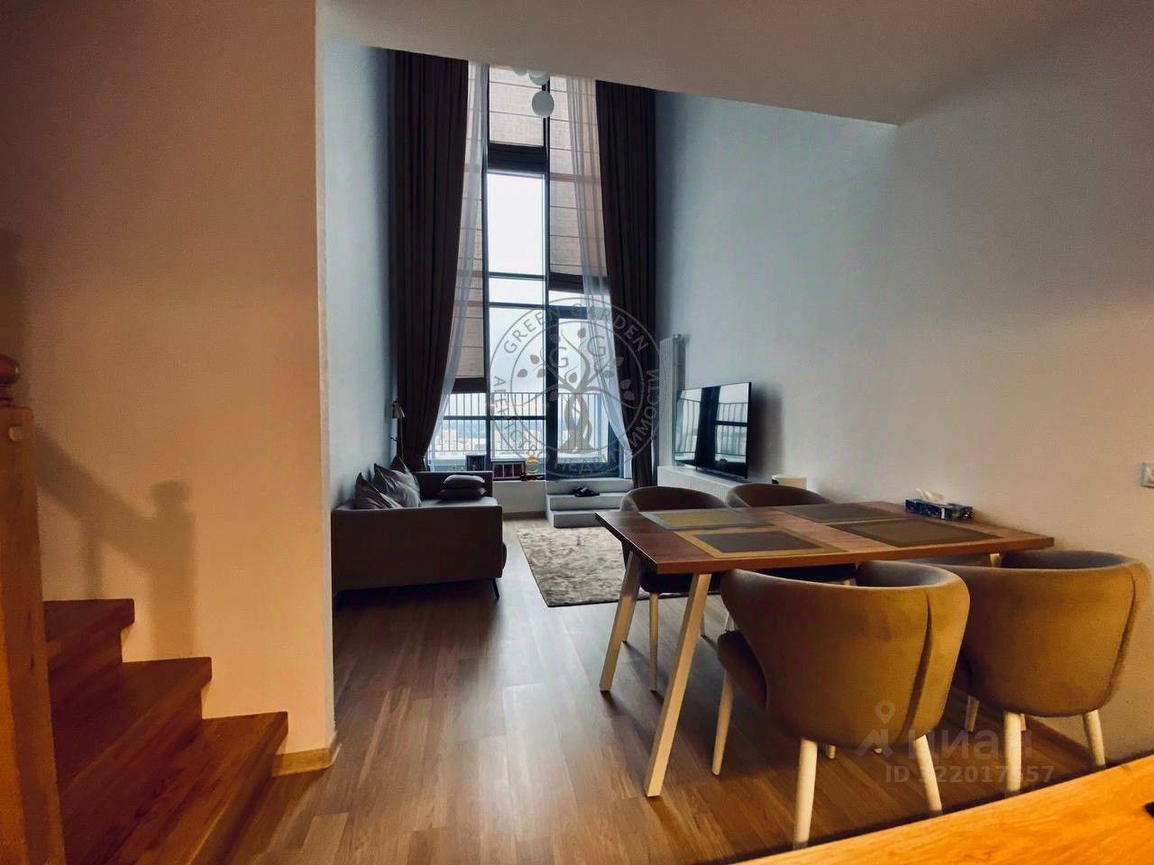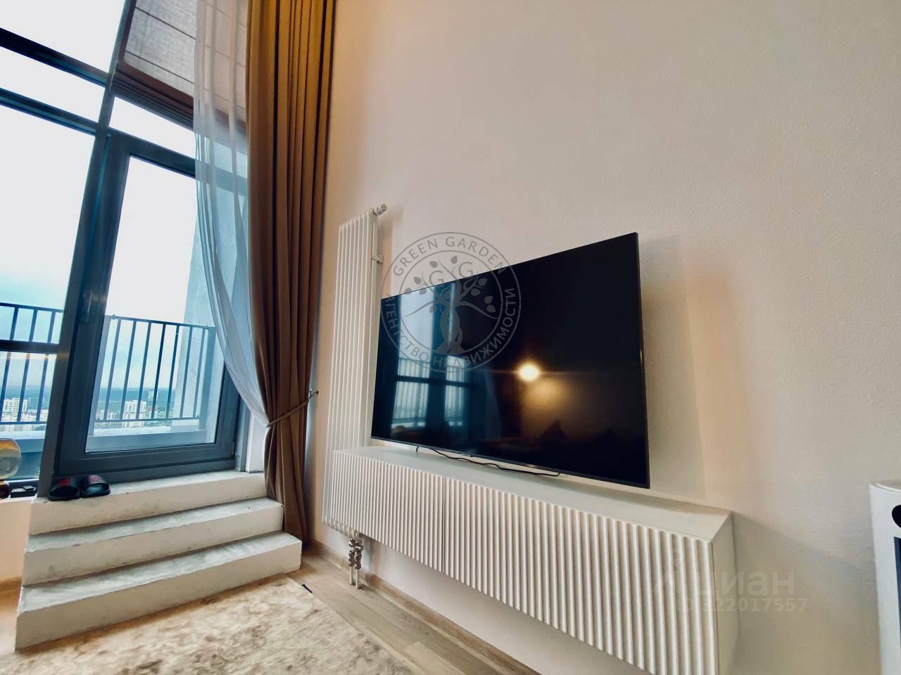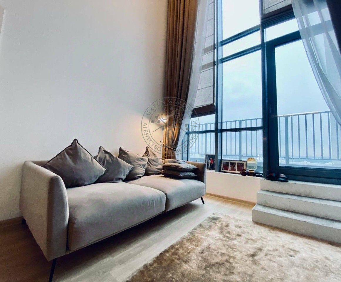 * Кухня-гостиная: Стильный гарнитур, потолки 7 метров, панорамные окна. Пространство отапливается современным вертикальным радиатором, пол в зоне лестницы с подогревом делает квартиру особенно комфортной.