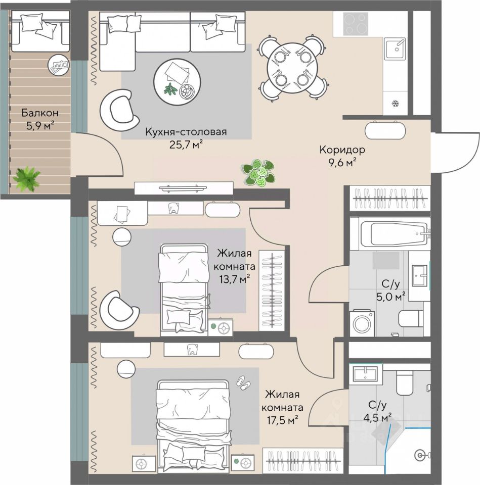 Продаётся 2-комнатная квартира в строящемся доме (Секции 1.4-1.6 (2 очередь)), срок сдачи: IV-кв. 2026, общей площадью 77.8 кв.м., на 4 этаже.
