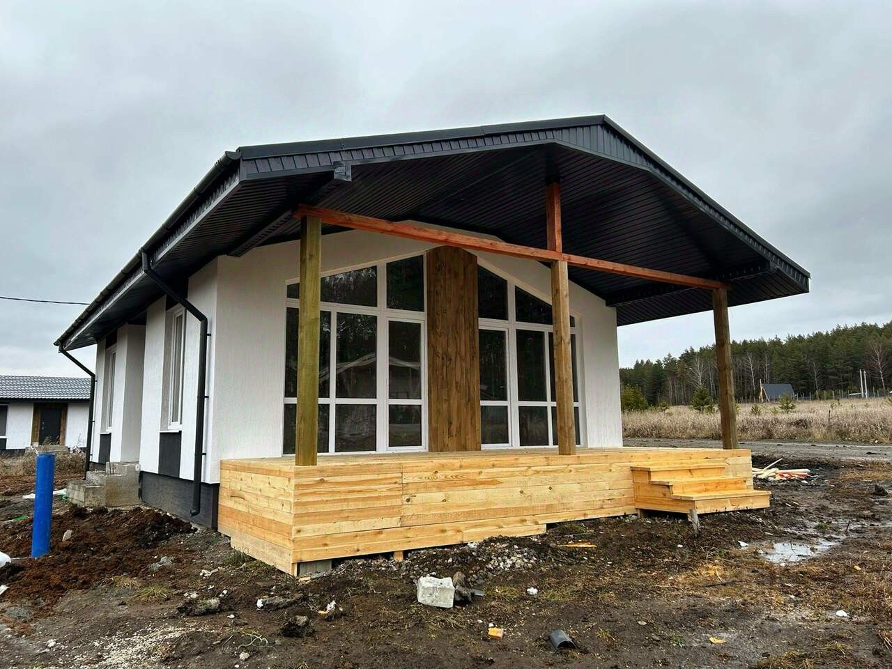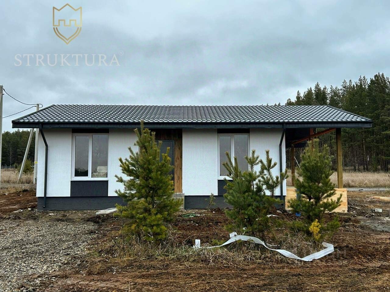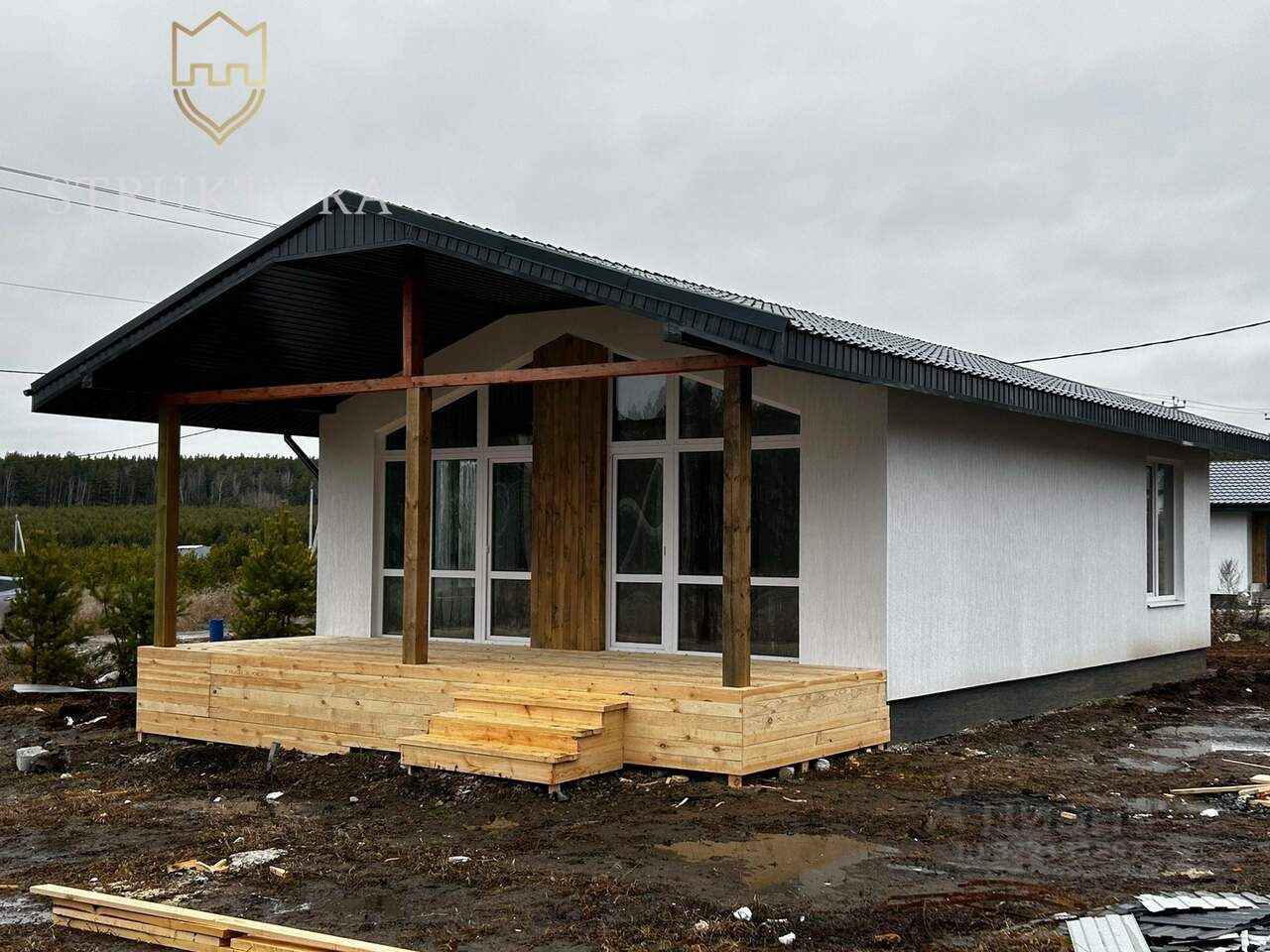 Участок правильной формы, солнечный и ровный, что упрощает организацию ландшафтного дизайна без лишних затрат. На территории достаточно места для парковки автомобиля, строительства навеса или гаража, а также для обустройства зоны отдыха с купелью на дровах или даже бани. Фасад дома выполнен в сдержанном чёрно-белом стиле с декоративной штукатуркой. Контрастное сочетание цветов дополнено элегантными деревянными элементами по периметру здания. Крыша покрыта надёжной металлочерепицей, которая защитит от любых погодных условий. Внутри дома продуманная планировка: холл, две изолированные спальни. Центральное место занимает большая кухня-гостиная, объединённая с террасой. В доме один санузел. Особая изюминка дома — терраса с прекрасным видом на окружающий пейзаж. Здесь можно наслаждаться утренними часами под пение птиц и проводить спокойные вечера, наблюдая за природой. Есть два варианта на выбор: полностью готовый ремонт или вариант ''white box'' — базовая отделка, позволяющая создать интерьер по своему вкусу.