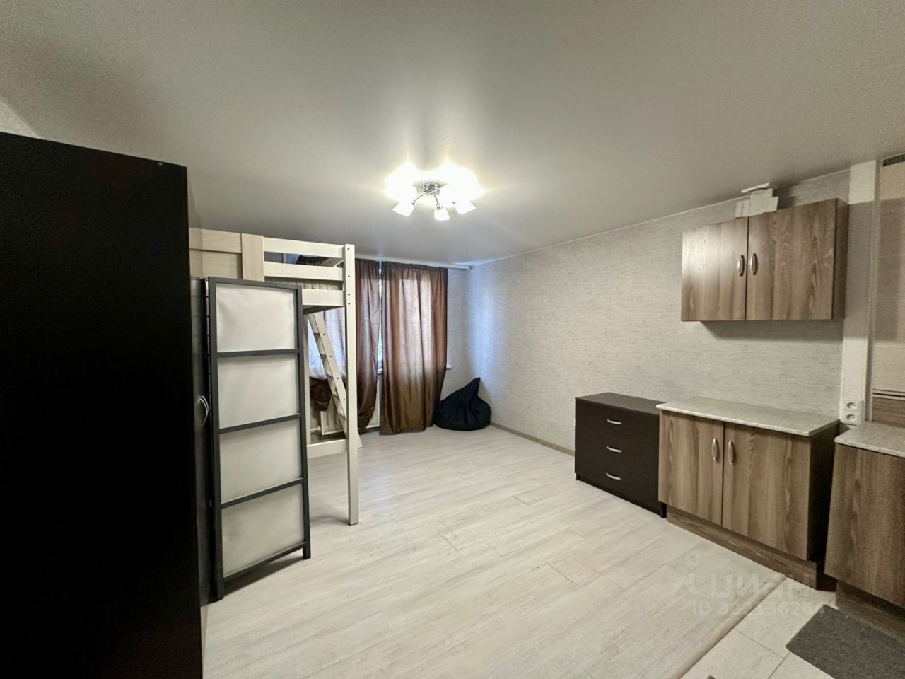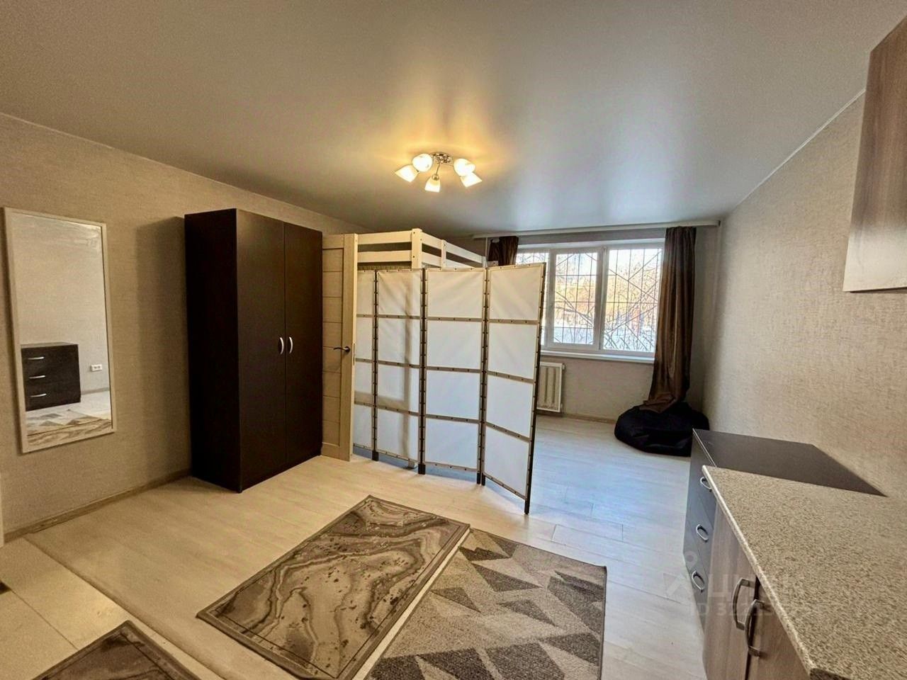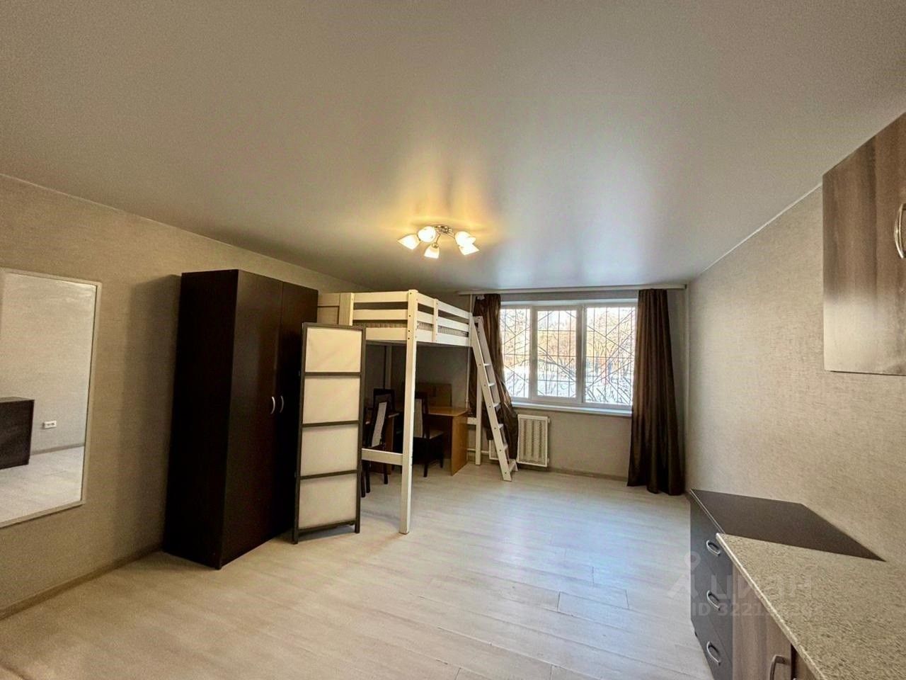 В комнате остается новая и качественная мебель, а также в комнате натяжной потолок, светлый ламинат, качественные обои.