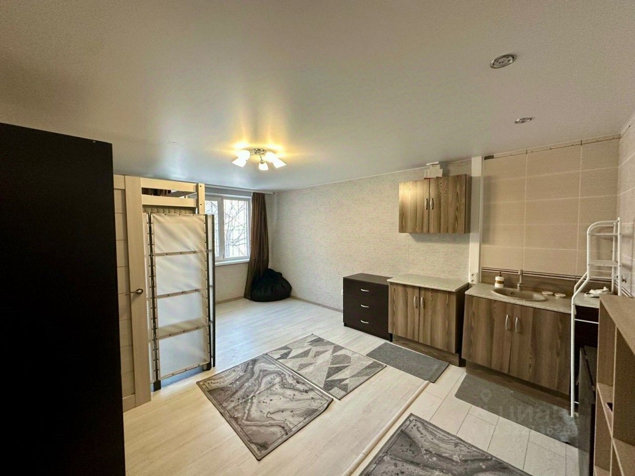 В комнате остается новая и качественная мебель, а также в комнате натяжной потолок, светлый ламинат, качественные обои.