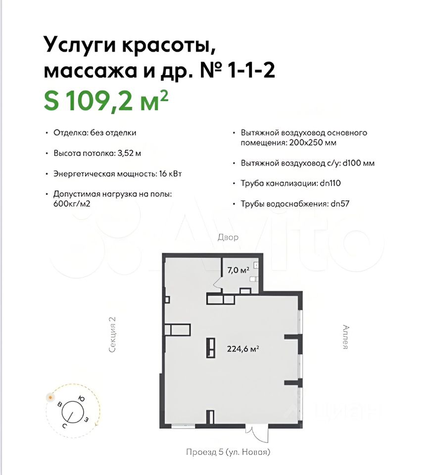 Характеристики объекта: Общая площадь: 109.2 кв. М. 1 этаж. Отдельный вход. Потолки: 3.52м2. Отделка под чистовую. Электрическая мощность: 16 квт. Передача ключей 2 квартал 2028 года.