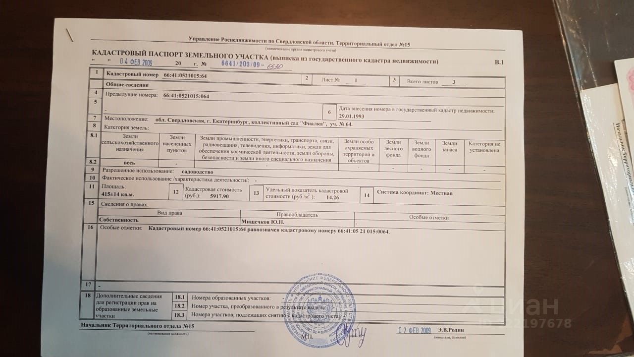 Продаётся садовый участок (S = 415кв.м.+/-14кв.м.) с постройками и посадками, по адресу: Свердловская область, г. Екатеринбург, коллективный сад Фиалка, 3-я ул., уч. 64 (Челябинский тракт (М-5), кадастровый номер: 66:41:0521015:64