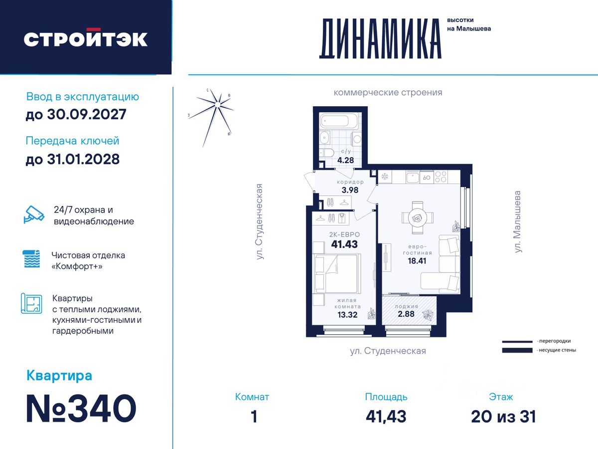Настройте жизнь на максимум В Динамике воплощают мечты. Её фасады стремятся ввысь и рисуют силуэт ступеней — символа вашего движения, где всё задуманное сбывается. В интеллигентном микрорайоне Втузгородок всё под рукой. Пешком до остановки 5 минут, на машине до центра — 10. Соседство с торговыми комплексами и доступность ЕКАД входят в число преимуществ квартала наравне с близостью УРФУ, главных театров, филармонии, школ и детсадов. Выгляните в окно — и увидите знаменитое озеро Шарташ, которому около миллиона лет. Здесь катаются на сапах, лодках и катамаранах, а в Шарташском лесопарке вокруг озера — на велосипедах летом и лыжах зимой. Новое звучание района Выразительные башни Динамики притягивают взгляды издалека. Сплошные стеклянные витражи фасадов меняют восприятие проекта в зависимости от ракурса, времени года и суток. В квартирах с витражным остеклением алюминиевые оконные рамы и широкие подоконники визуально увеличивают пространство. Благодаря современным технологиям витражи обеспечивают дополнительную теплоизоляцию, помогая сохранять комфортный микроклимат в квартире и летом, и зимой. Отдых в вашем ритме Выбирайте досуг по душе для себя и семьи. Занимайтесь на тренажёрах и воркаут-комплексе, играйте в пинг-понг, футбол или баскетбол. А детей предоставьте насыщенному плейхабу, который тренирует тактильность и равновесие в атмосфере безопасности и контролируемого риска. Размеренно прогуливайтесь меж декоративных холмов, под тенистыми навесами-перголами вблизи удобных скамеек, многолетних трав и разновысотной уличной мебели. СТРОЙТЭК возводит Динамику в 3 этапа. Второй этап строительства В нём 2 секции. С2 — престижная высотка в 31 этаж. Здесь 209 квартир от 1- до 3-комнатных и 19 уникальных планировок с просторными кухнями-гостиными до 21 м квадратного. Кроме того, закрытый паркинг на 31 место и 40 кладовых-келлеров внутри стилобата. В подъезде С2 — светлый холл с минималистичным дизайном бизнес-класса, помещения для колясок и самокатов, а также 3 надёжных лифта на 1 000 кг каждый. С4 — парадный 6-этажный дом с элегантной смещённой геометрией и полным витражным остеклением всех 5 жилых этажей. Внизу расположено впечатляющее лобби с лаунж-зоной и стойкой ресепшен, атмосферная уличная площадь для встреч и торговая галерея. В секции всего 34 квартиры в 16 уникальных планировках от студий до 3-комнатных. Это особый уровень респектабельной и неторопливой жизни. Технологии комфорта Обратите внимание на специальные форматы планировок с гардеробными и тёплыми лоджиями. Отдельно в С4 — на видовые квартиры с террасами на 5 и 6 этажах, а также лоты с мастер-спальнями, где у приватного пространства для отдыха своя ванная. Что касается отделки — в Динамике улучшенный стандарт ''Комфорт+''. Помимо привычных комфортных сантехники и электрики, в него входят оконные стёкла Energy Light, приточные клапаны вентиляции Air-Box, особо прочный ламинат 33 класса и устойчивые к многократной покраске виниловые обои. Белые межкомнатные двери и плинтусы лаконично подчеркну