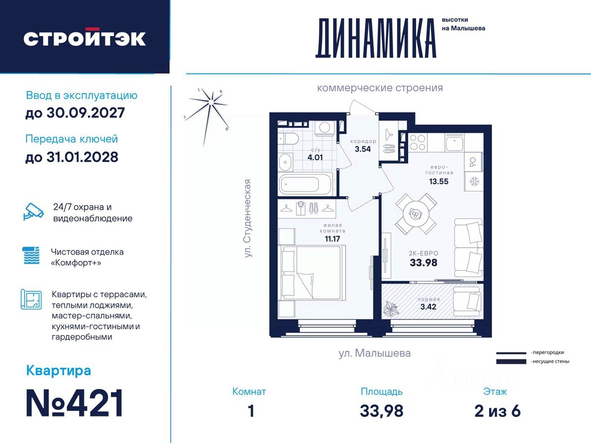 Настройте жизнь на максимум В Динамике воплощают мечты. Её фасады стремятся ввысь и рисуют силуэт ступеней — символа вашего движения, где всё задуманное сбывается. В интеллигентном микрорайоне Втузгородок всё под рукой. Пешком до остановки 5 минут, на машине до центра — 10. Соседство с торговыми комплексами и доступность ЕКАД входят в число преимуществ квартала наравне с близостью УРФУ, главных театров, филармонии, школ и детсадов. Выгляните в окно — и увидите знаменитое озеро Шарташ, которому около миллиона лет. Здесь катаются на сапах, лодках и катамаранах, а в Шарташском лесопарке вокруг озера — на велосипедах летом и лыжах зимой. Новое звучание района Выразительные башни Динамики притягивают взгляды издалека. Сплошные стеклянные витражи фасадов меняют восприятие проекта в зависимости от ракурса, времени года и суток. В квартирах с витражным остеклением алюминиевые оконные рамы и широкие подоконники визуально увеличивают пространство. Благодаря современным технологиям витражи обеспечивают дополнительную теплоизоляцию, помогая сохранять комфортный микроклимат в квартире и летом, и зимой. Отдых в вашем ритме Выбирайте досуг по душе для себя и семьи. Занимайтесь на тренажёрах и воркаут-комплексе, играйте в пинг-понг, футбол или баскетбол. А детей предоставьте насыщенному плейхабу, который тренирует тактильность и равновесие в атмосфере безопасности и контролируемого риска. Размеренно прогуливайтесь меж декоративных холмов, под тенистыми навесами-перголами вблизи удобных скамеек, многолетних трав и разновысотной уличной мебели. СТРОЙТЭК возводит Динамику в 3 этапа. Второй этап строительства В нём 2 секции. С2 — престижная высотка в 31 этаж. Здесь 209 квартир от 1- до 3-комнатных и 19 уникальных планировок с просторными кухнями-гостиными до 21 м квадратного. Кроме того, закрытый паркинг на 31 место и 40 кладовых-келлеров внутри стилобата. В подъезде С2 — светлый холл с минималистичным дизайном бизнес-класса, помещения для колясок и самокатов, а также 3 надёжных лифта на 1 000 кг каждый. С4 — парадный 6-этажный дом с элегантной смещённой геометрией и полным витражным остеклением всех 5 жилых этажей. Внизу расположено впечатляющее лобби с лаунж-зоной и стойкой ресепшен, атмосферная уличная площадь для встреч и торговая галерея. В секции всего 34 квартиры в 16 уникальных планировках от студий до 3-комнатных. Это особый уровень респектабельной и неторопливой жизни. Технологии комфорта Обратите внимание на специальные форматы планировок с гардеробными и тёплыми лоджиями. Отдельно в С4 — на видовые квартиры с террасами на 5 и 6 этажах, а также лоты с мастер-спальнями, где у приватного пространства для отдыха своя ванная. Что касается отделки — в Динамике улучшенный стандарт ''Комфорт+''. Помимо привычных комфортных сантехники и электрики, в него входят оконные стёкла Energy Light, приточные клапаны вентиляции Air-Box, особо прочный ламинат 33 класса и устойчивые к многократной покраске виниловые обои. Белые межкомнатные двери и плинтусы лаконично подчеркну