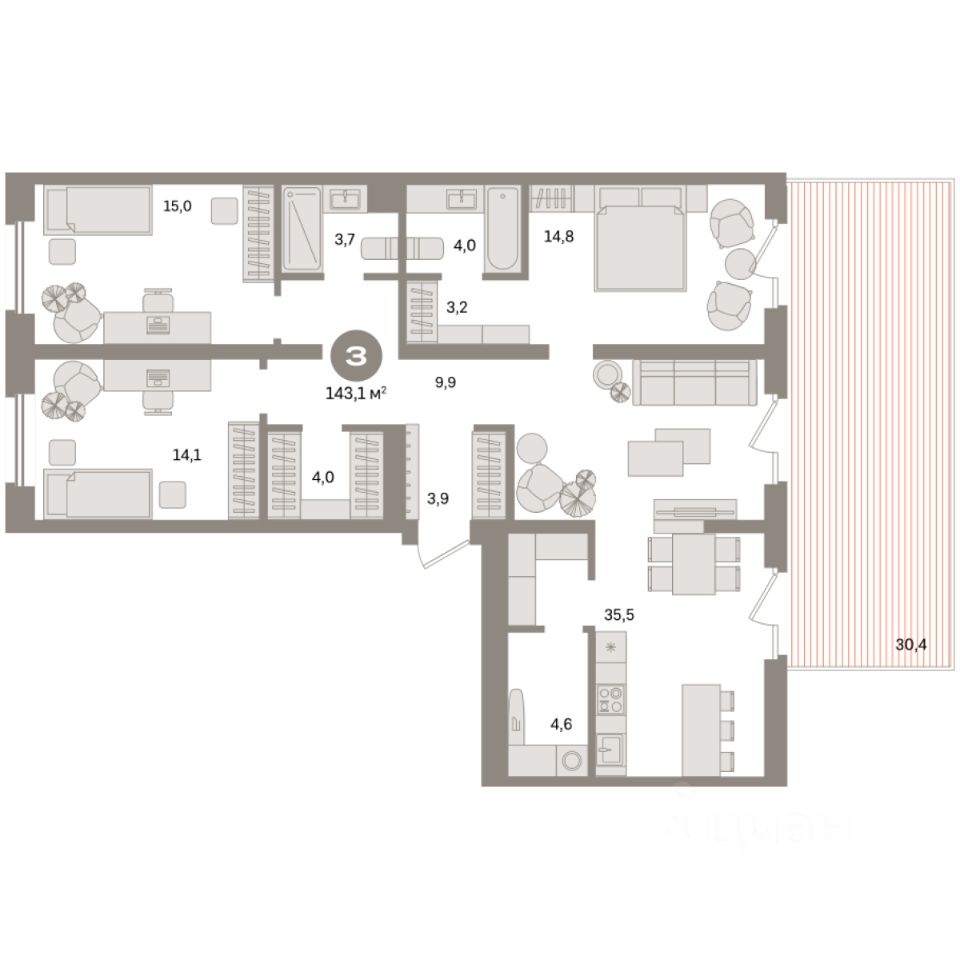 Квартира с кухней-гостиной и тремя спальнями в Южных кварталах. Особенности планировки: окна на две стороны, второй санузел, гардеробная, окна в пол, вид во двор, разнесённые спальни, предчистовая отделка, мастер-спальня, постирочная, терраса на крыше. квартиры в нашей базе: ЮК04-А1-3-3.2.4.
