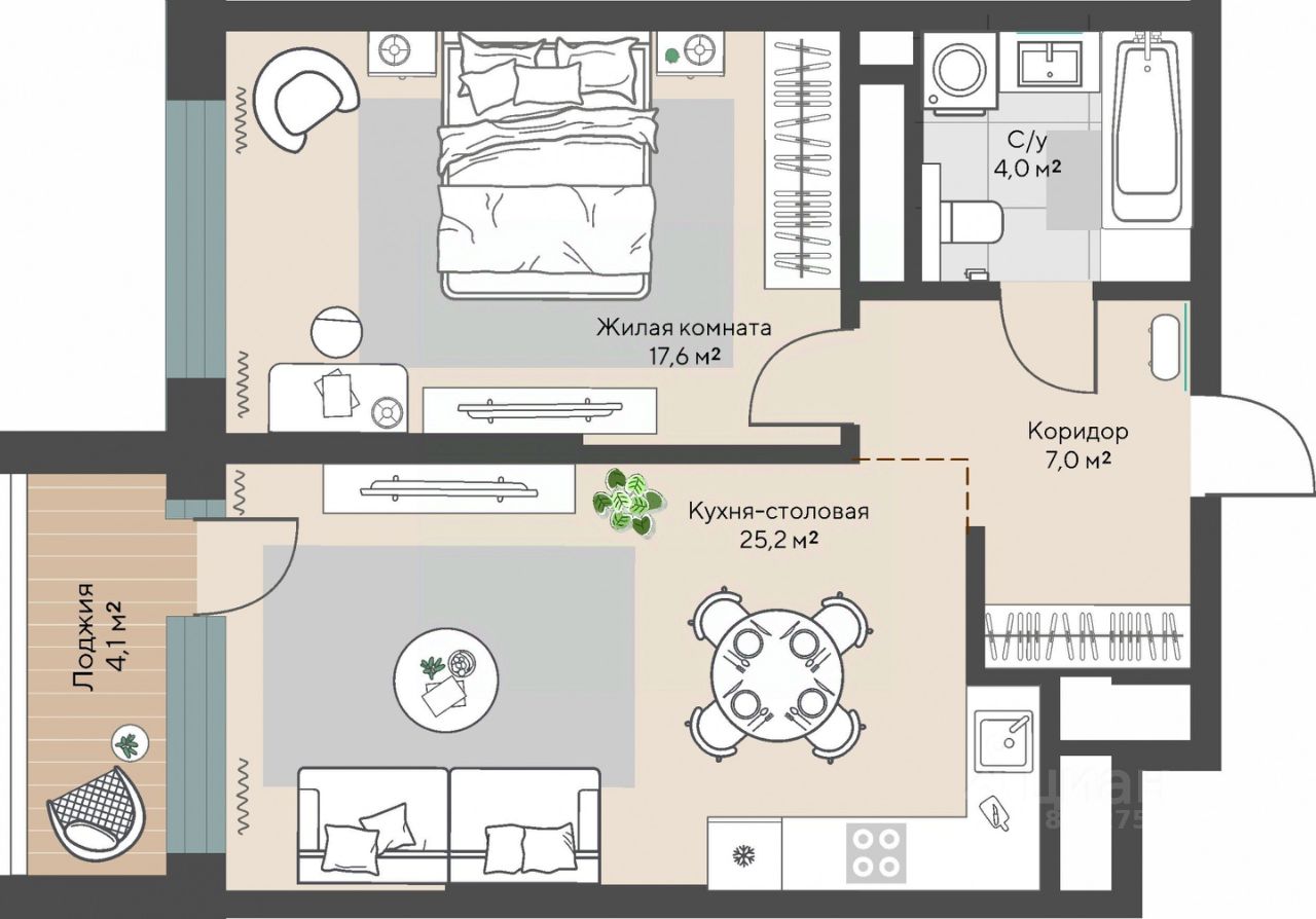 Продаётся 1-комнатная квартира в строящемся доме (Дом 1 этап 1.1), срок сдачи: I-кв. 2028, общей площадью 55.9 кв.м., на 6 этаже.