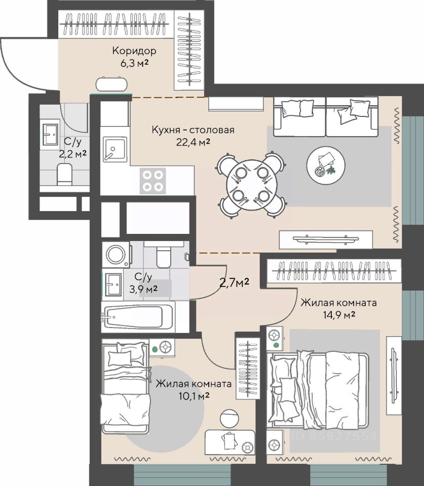 Продаётся 2-комнатная квартира в строящемся доме (Дом 1 этап 1.1), срок сдачи: I-кв. 2028, общей площадью 62.5 кв.м., на 6 этаже.