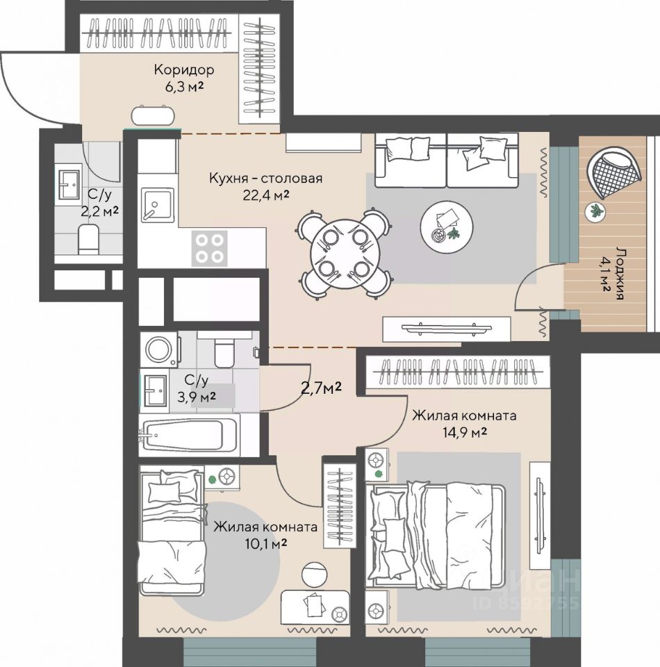 Продаётся 2-комнатная квартира в строящемся доме (Дом 1 этап 1.1), срок сдачи: I-кв. 2028, общей площадью 64.6 кв.м., на 22 этаже.