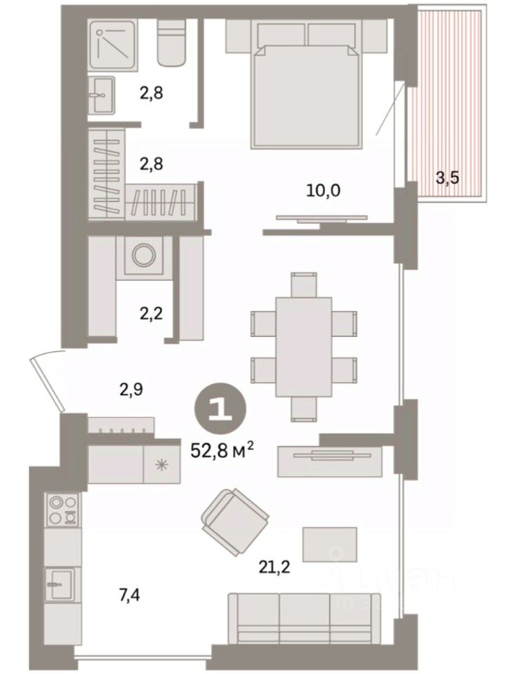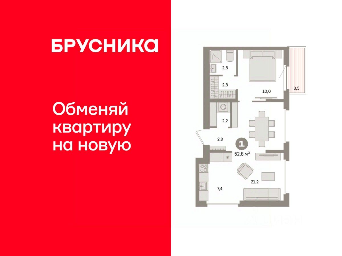 Квартира с кухней-гостиной и одной спальней в квартале ''Депо''. Особенности планировки: балкон, предчистовая отделка. квартиры в нашей базе: ДЕП07-Ж4.9.3.