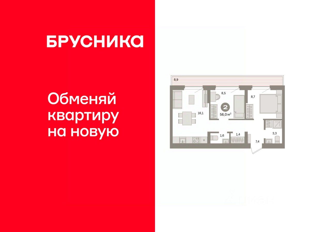Квартира с кухней-гостиной и двумя спальнями в квартале ''Депо''. Особенности планировки: предчистовая отделка, терраса на крыше. квартиры в нашей базе: ДЕП07-Ж2.7.4.