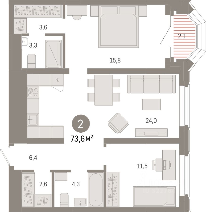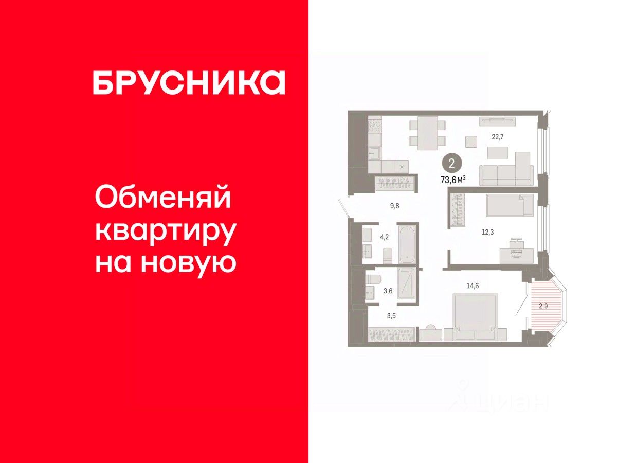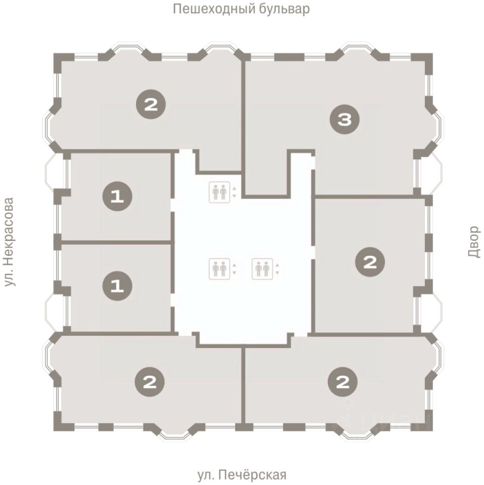 Квартира с кухней-гостиной и двумя спальнями в квартале ''На Некрасова''. Особенности планировки: предчистовая отделка. квартиры в нашей базе: НКР02-Ж1.11.6.