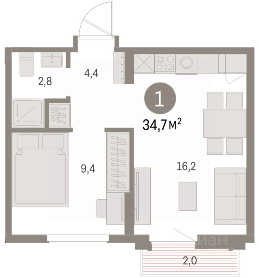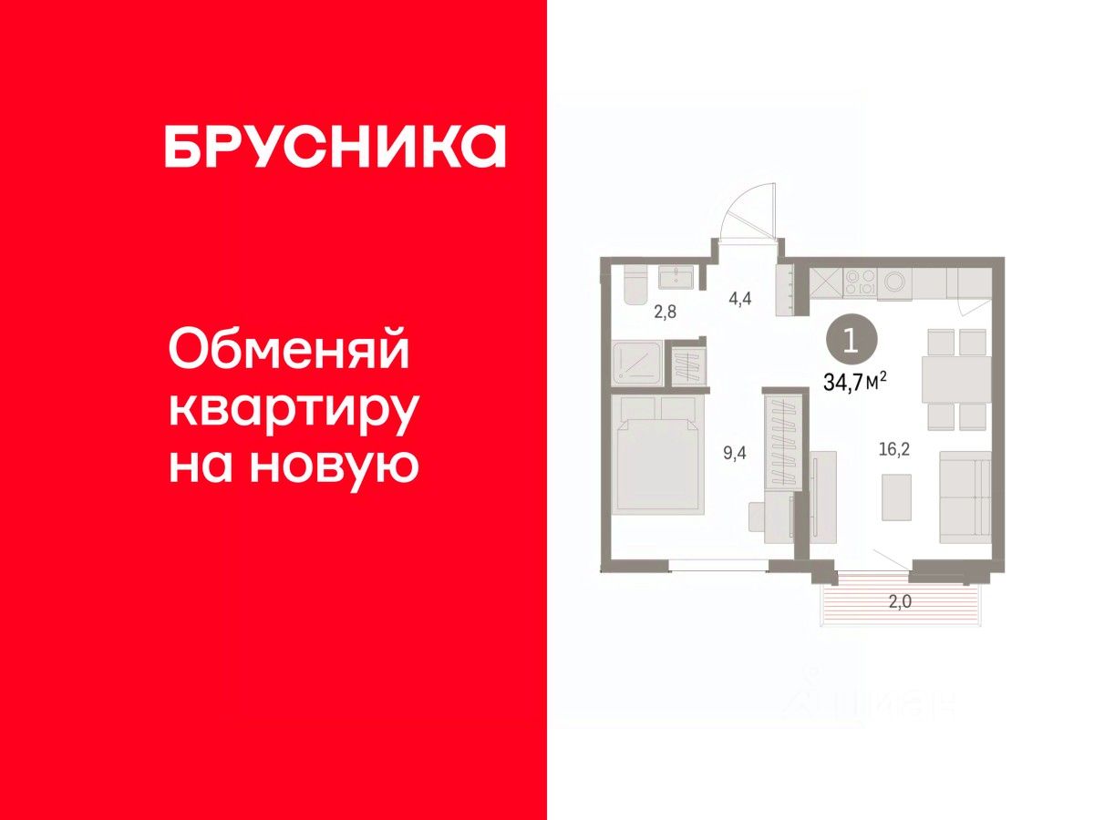Квартира с кухней-гостиной и одной спальней в Бруснике в Академическом. Особенности планировки: предчистовая отделка. квартиры в нашей базе: АКД05-Ж1.9.9.