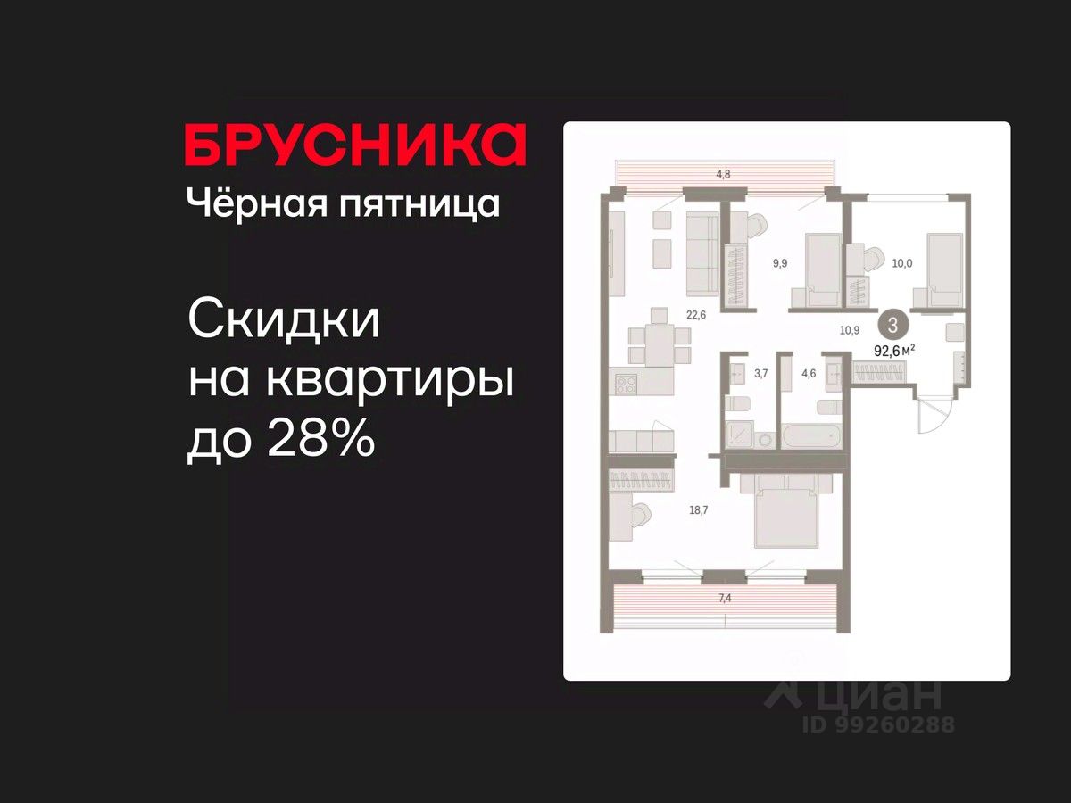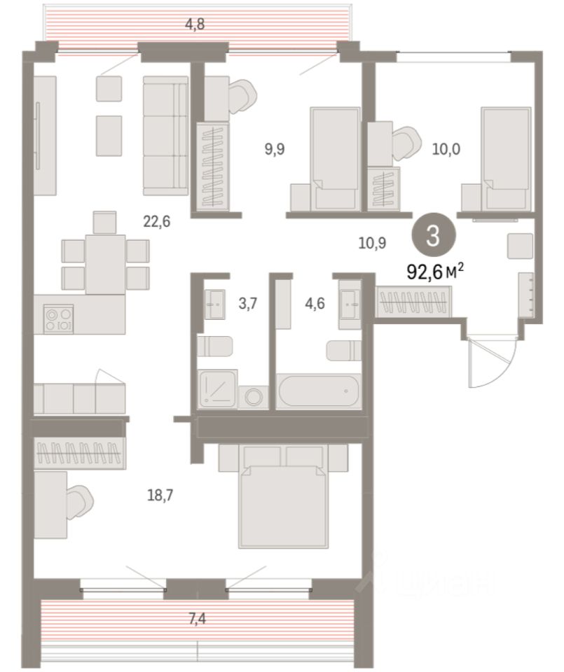 Квартира с кухней-гостиной и тремя спальнями в Бруснике в Академическом. Особенности планировки: окна на две стороны, второй санузел, разнесённые спальни, предчистовая отделка, балкон, терраса на крыше. квартиры в нашей базе: АКД05-Ж6.8.4.