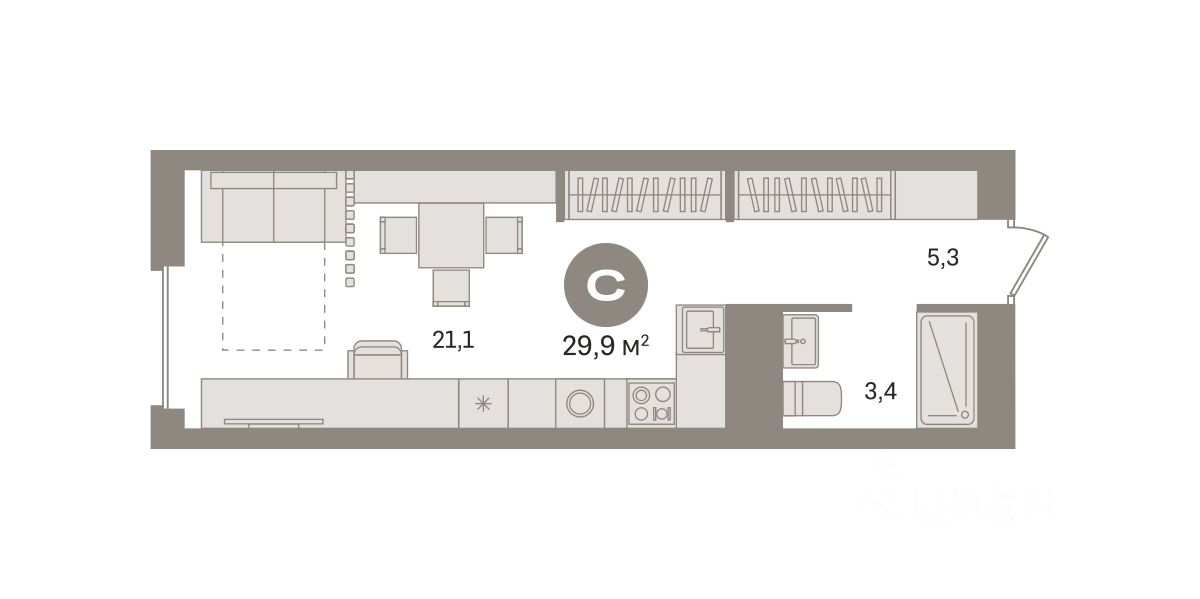 Студия в Северном квартале. Особенности планировки: предчистовая отделка. квартиры в нашей базе: СКВ04.2-Ж1.2.5.