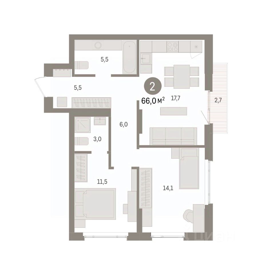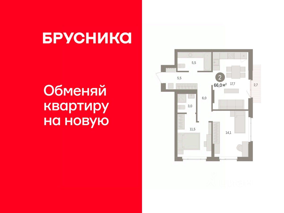 Квартира с кухней-гостиной и двумя спальнями в квартале ''Траектория''. Особенности планировки: балкон, предчистовая отделка, разнесённые спальни, стартовая цена. квартиры в нашей базе: МНВ01-Ж9.4.1.