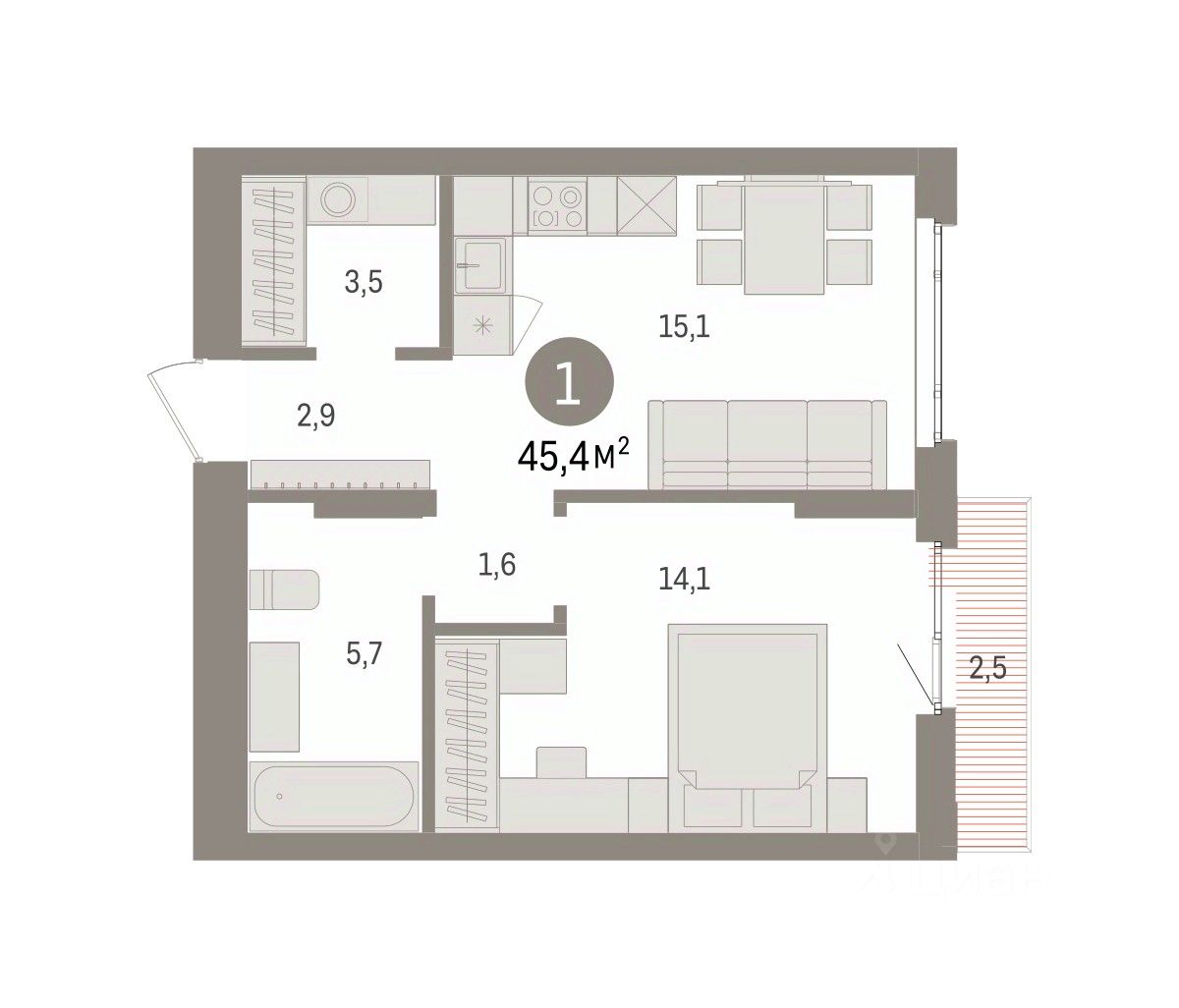 Общая площадь45,4 м2