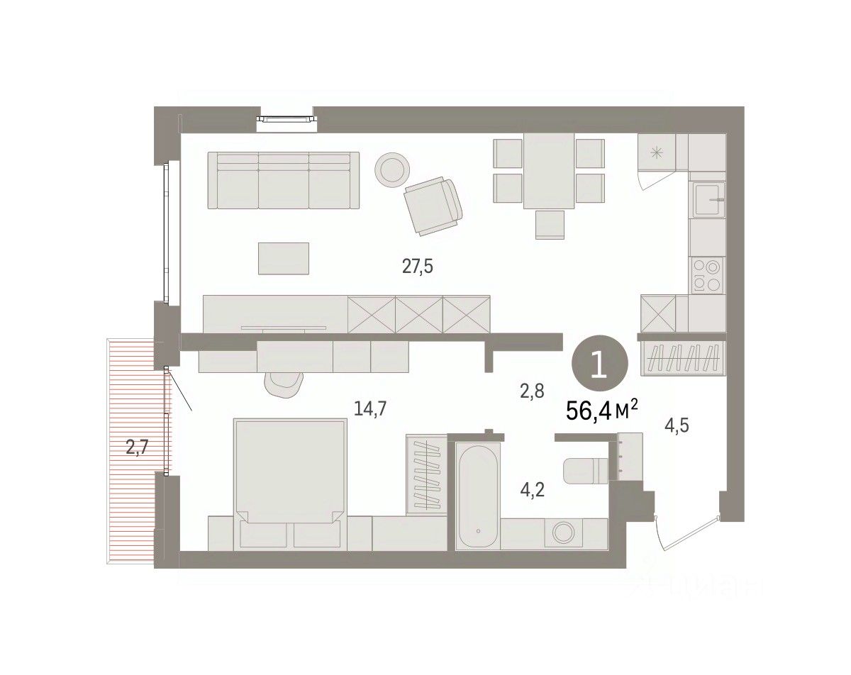 Квартира с кухней-гостиной и одной спальней в квартале ''Траектория''. Особенности планировки: балкон, предчистовая отделка. квартиры в нашей базе: МНВ01-Ж9.5.5.