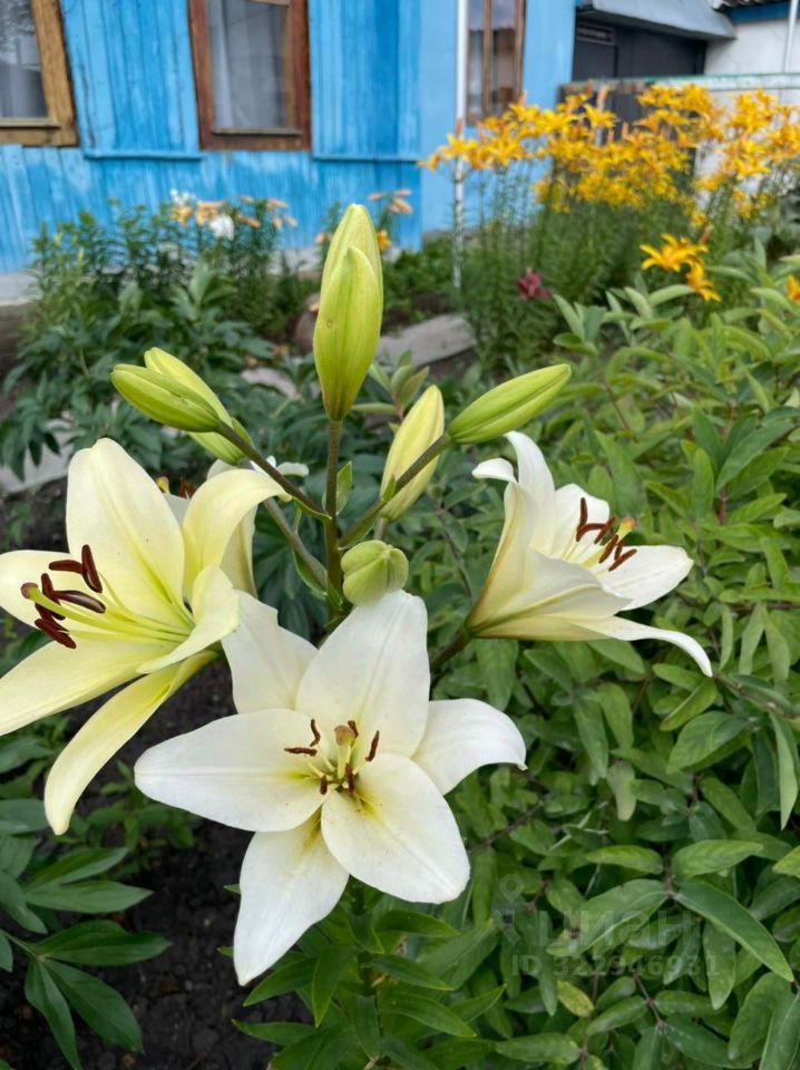 С лицевой стороны дома многолетные насаждения: лилии, пионы, флоксы, декоративные маки, лилейники,нарциссы, тюльпаны. А также вечнозеленые туи и прекрасные розы.