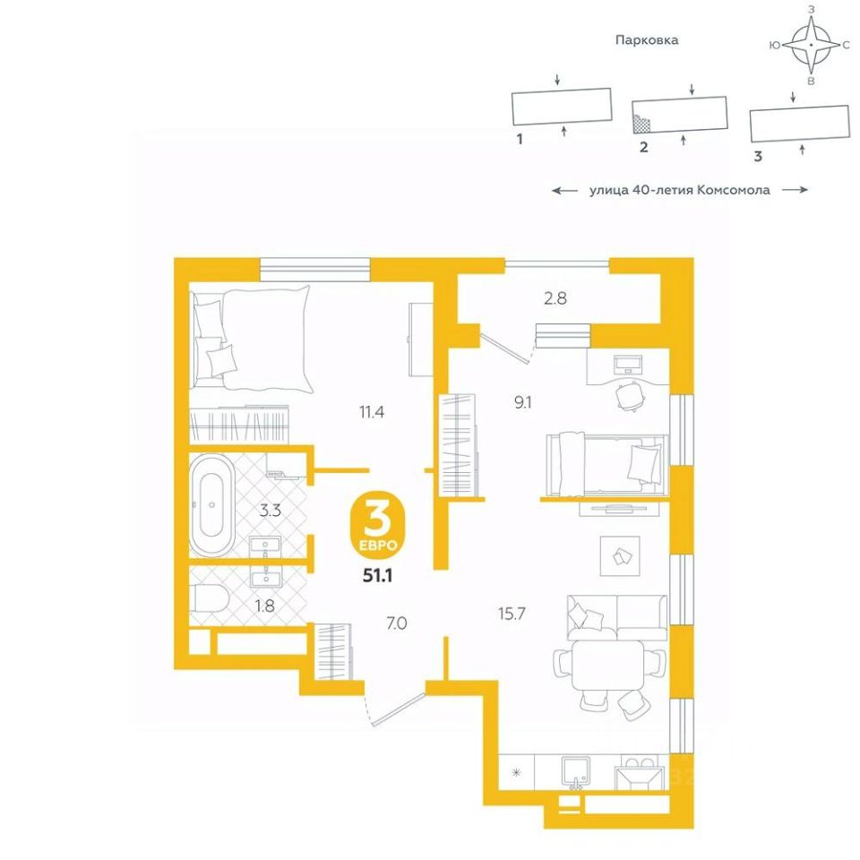 Квартира располагается в ЖК ''Комсомольский'' — жилом комплексе комфорт-класса. Здесь вы будете наслаждаться беззаботной жизнью, ведь ваш дом — воплощение практичности, безопасности и надежности. Для удобства предусмотрены колясочные на первых этажах домов, где можно оставить велосипеды и коляски в тепле. За безопасность отвечают система электронных ключей и видеонаблюдение. Еще здесь собственная котельная, поэтому в доме всегда будут горячая вода и оплата счетов только за фактически потребленное тепло.