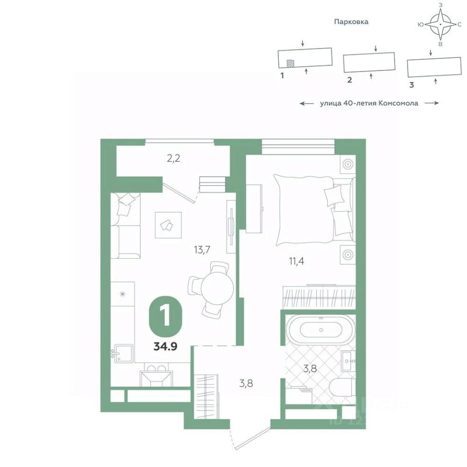 Квартира располагается в ЖК ''Комсомольский'' — жилом комплексе комфорт-класса. Здесь вы будете наслаждаться беззаботной жизнью, ведь ваш дом — воплощение практичности, безопасности и надежности. Для удобства предусмотрены колясочные на первых этажах домов, где можно оставить велосипеды и коляски в тепле. За безопасность отвечают система электронных ключей и видеонаблюдение. Еще здесь собственная котельная, поэтому в доме всегда будут горячая вода и оплата счетов только за фактически потребленное тепло.