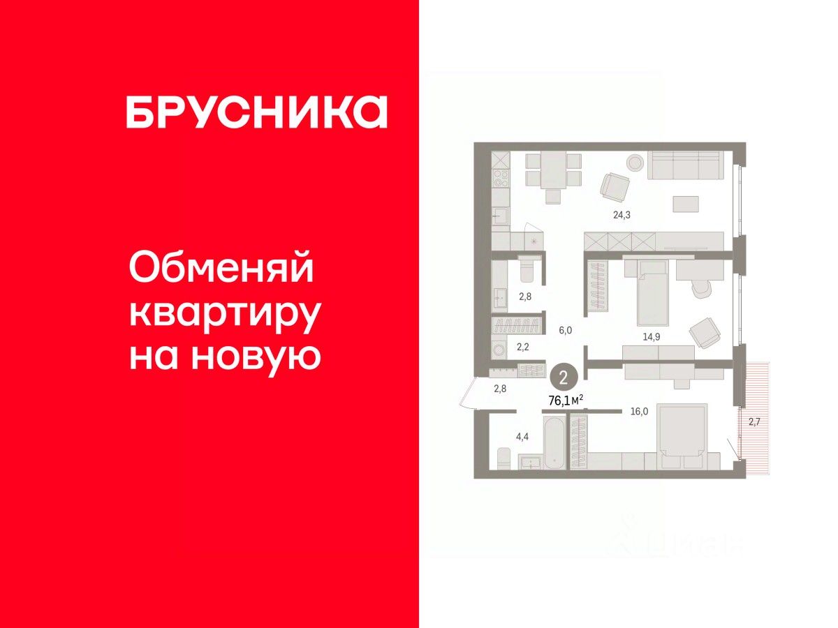 Квартира с кухней-гостиной и двумя спальнями в квартале ''Траектория''. Особенности планировки: балкон, вид во двор, второй санузел, гардеробная, предчистовая отделка, разнесённые спальни, стартовая цена. квартиры в нашей базе: МНВ01-Ж9.4.6.