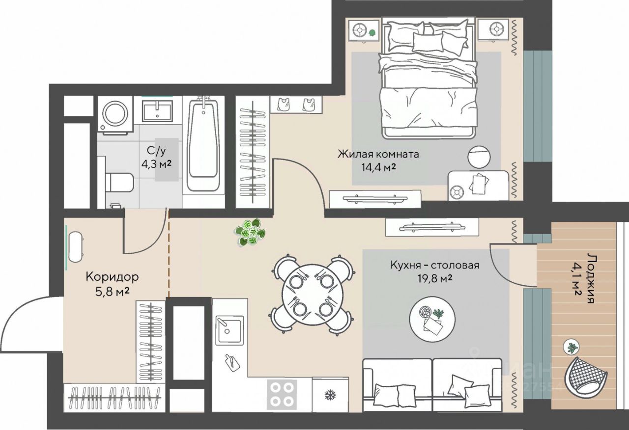 Продаётся 1-комнатная квартира в строящемся доме (Дом 1 этап 1.1), срок сдачи: I-кв. 2028, общей площадью 46.4 кв.м., на 9 этаже.