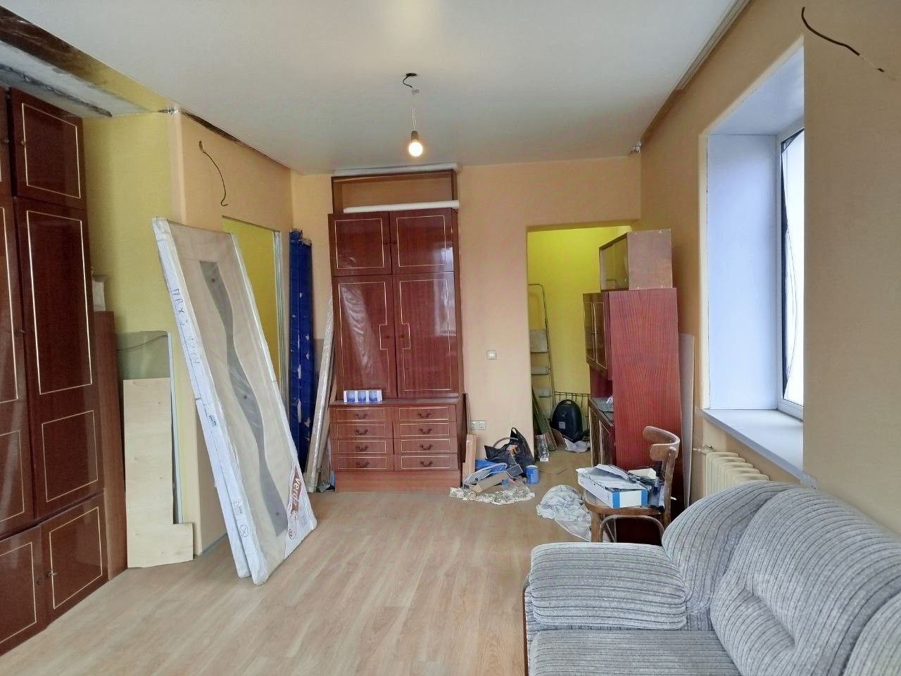В квартире частично сделан качественный ремонт. Сделана перепланировка (узаконена). Поменяна электропроводка. В доме тянут общую новую проводку. Входнaя двеpь железная, на полу новый ламинат, под ним уложена фанера, полы не скрипят. Частично натянут потолок. Поставлены плacтикoвые oкнa.