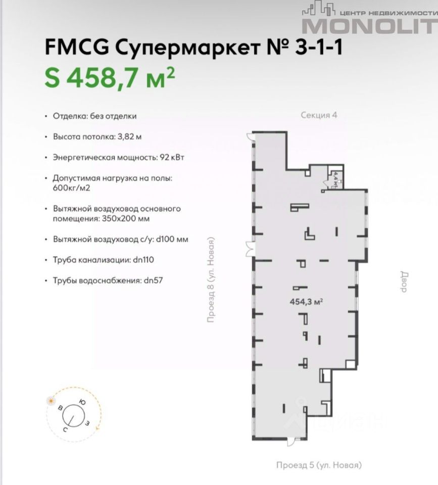 Характеристики объекта: Общая площадь: 458.7 кв.м. 1 этаж. Отдельный вход. Потолки 3.82 м2. Отделка под чистовую. Электрическая мощность 92 кВт. Передача ключей 2 квартал 2028 года.