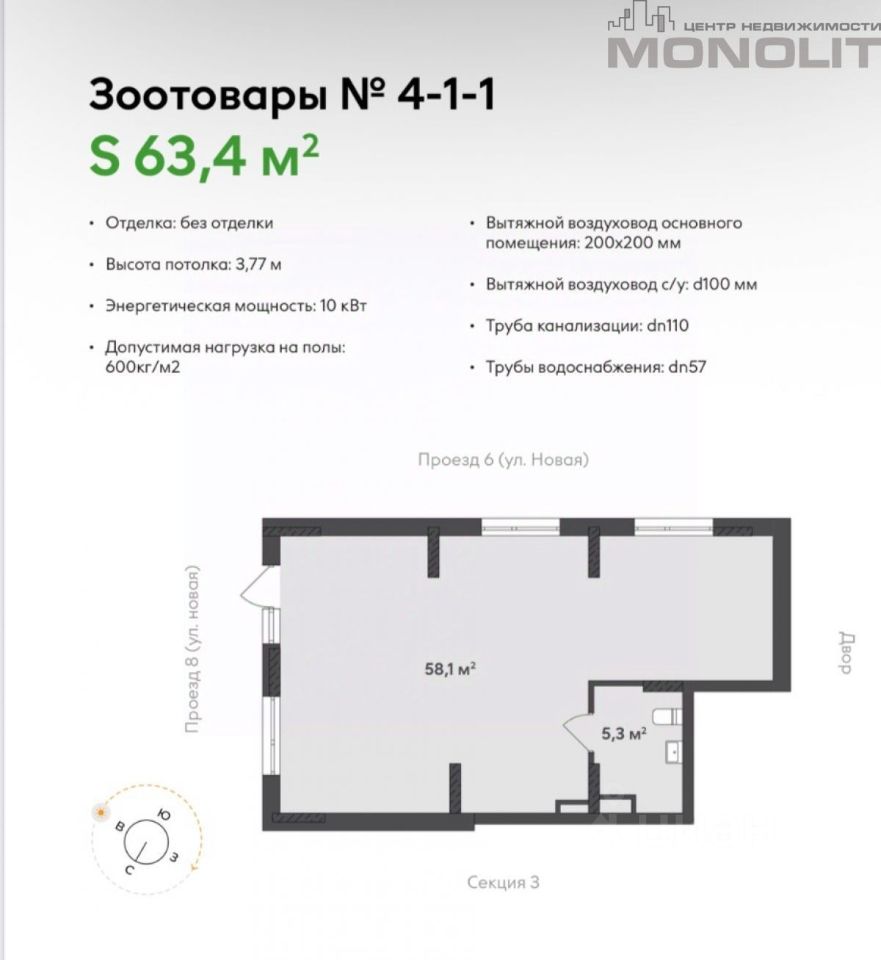 Характеристики объекта: Общая площадь: 63.4 кв.м. 1 этаж. Отдельный вход. Потолки 3.77 м2. Отделка под чистовую. Электрическая мощность 10 кВт. Передача ключей 2 квартал 2028 года.