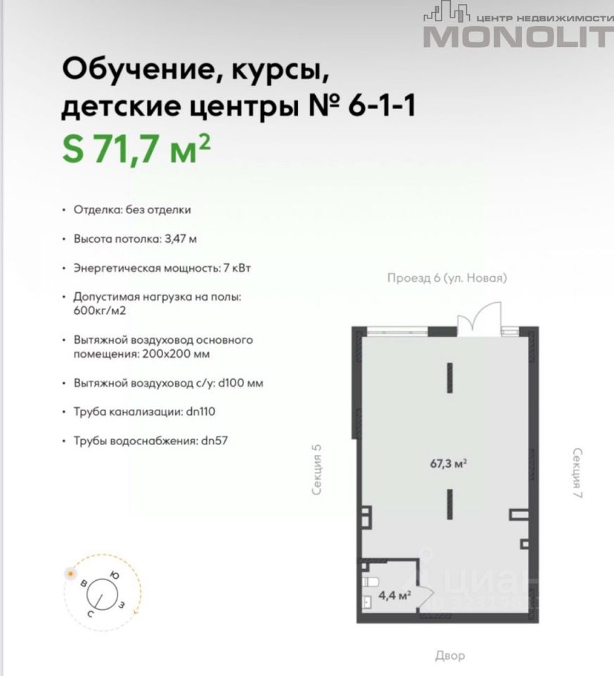 Характеристики объекта: Общая площадь: 71.7 кв.м. 1 этаж. Отдельный вход. Потолки 3.47 м2. Отделка под чистовую. Электрическая мощность 7 кВт. Передача ключей 2 квартал 2028 года.