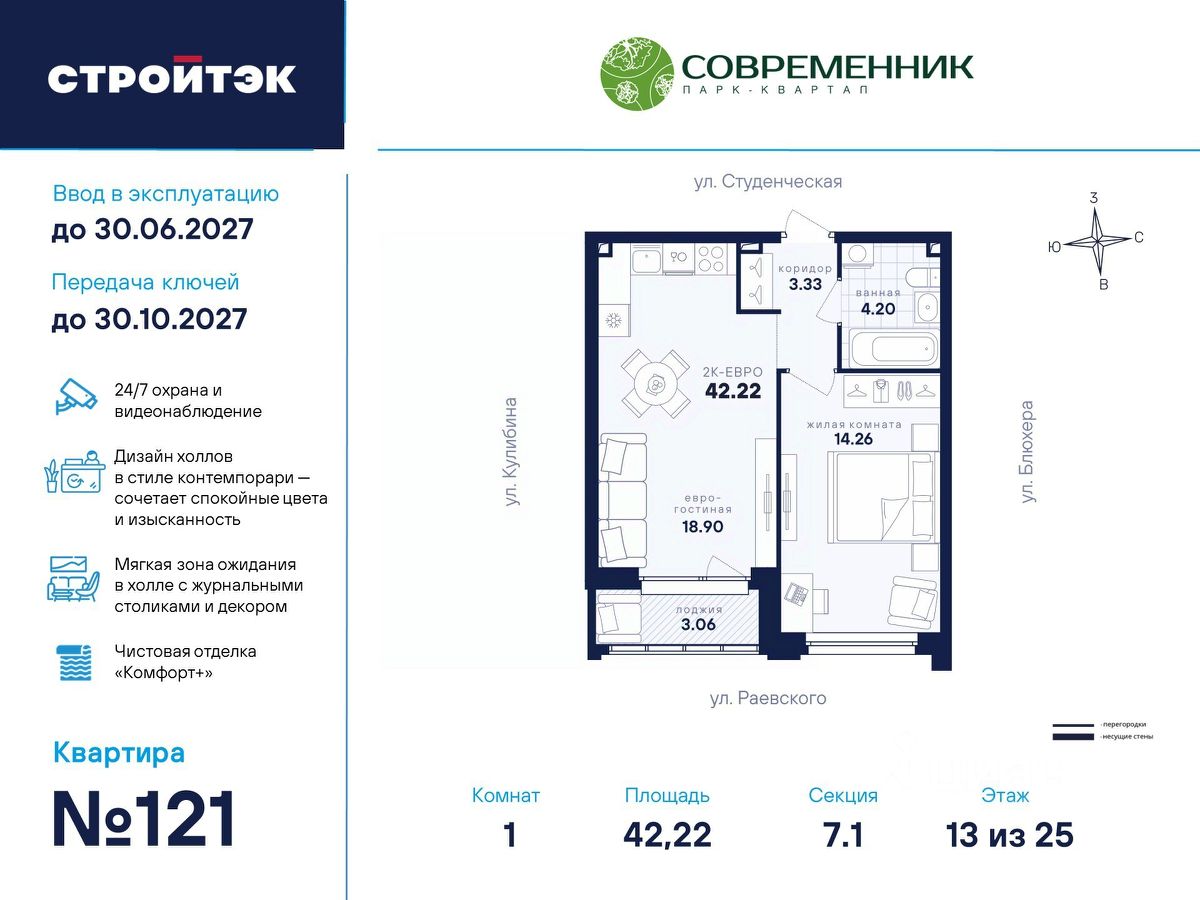 Время жить счастливо Современник — знаковый парк-квартал в интеллигентном районе Втузгородок, откуда недалеко до центра, а вблизи ведущие вузы и театры. Квартал состоит из 8 очередей строительства. Шесть очередей уже сданы и заселены, седьмая строится. В продаже квартиры от застройщика: 1 этап седьмой очереди. Объединяет квартал большой внутренний парк площадью в гектар — богатый прогулочными маршрутами, тенистыми деревьями, пространствами для отдыха, спорта и детских игр. С внешней стороны, у домов седьмой очереди, появится гостевой центр. Проект создавали в KCAP Architects and Planners, архитектурном бюро из Нидерландов, чьи работы украшают ландшафты Гамбурга, Антверпена и других городов Европы. Технологии, продуманное пространство и трендовый облик зданий создают размеренную атмосферу для жизни здесь. Достойное окружение До проспекта Ленина на машине вы доберётесь за 10 минут, а с другой стороны, неподалёку — Шарташский лесопарк с озером Шарташ, которому около миллиона лет. Здесь для вас пляжи, лодочные станции, тропы для бега и кафе. В квартале уже работают супермаркеты, пекарни, салон красоты и не только. Ближние школы, гимназии и университеты помогут расправить крылья новым поколениям, а детские сады станут заботливой средой в начале пути. Кстати, на территории квартала спроектирован муниципальный детский сад на 200 мест. Выходите во двор Гуляйте по зелёным аллеям или устройтесь с книгой в гамаке. Займитесь воркаутом, футболом, баскетболом или пинг-понгом. Проводите семейные праздники под крытым амфитеатром или отправьте детей играть на насыщенный плейхаб. Мы всё предусмотрели. На закрытой территории без машин и посторонних спокойно и безопасно. Видеонаблюдение и освещение добавляют ещё больше уверенности. Впечатляющая доминанта у домов 7 очереди — новый гостевой центр: камерное пространство под навесом-перголой с озеленением и скамейками, чтобы встречать друзей. Ваша зона комфорта Стильное лобби Современника мы выполним в эстетике contemporary: минимализм, сочетание дерева со штукатуркой и тёмным металлом, зеркала, витражи. Обстановка из мягкой мебели, растений и книг. Двери из холла выходят на обе стороны. Внутри — комната для колясок и самокатов. На -1 этаже подземный паркинг с 201 машино-местом, куда легко попасть на лифте прямо с вашего этажа. Здесь же можно приобрести одну из 67 кладовых, чтобы хранить сезонный инвентарь. СТРОЙТЭК возводит 7 очередь в 3 этапа. Дом с привилегиями Первый этап — секция 7.1, башня в 25 этажей. Здесь 246 квартир в 19 уникальных планировках от студий до 3-комнатных, в классических и евро-вариантах. Просторные кухни-гостиные, гардеробные и окна на 2 стороны — лишь часть их плюсов. В Современнике улучшенный стандарт отделки ''Комфорт +''. Помимо комфортных сантехники и электрики, в него входят оконные стёкла Energy Light, которые помогают сохранять температуру, прочный ламинат 33 класса и устойчивые к многократной покраске виниловые обои. Белые межкомнатные двери и плинтусы подчеркнут любую цветовую гамму.