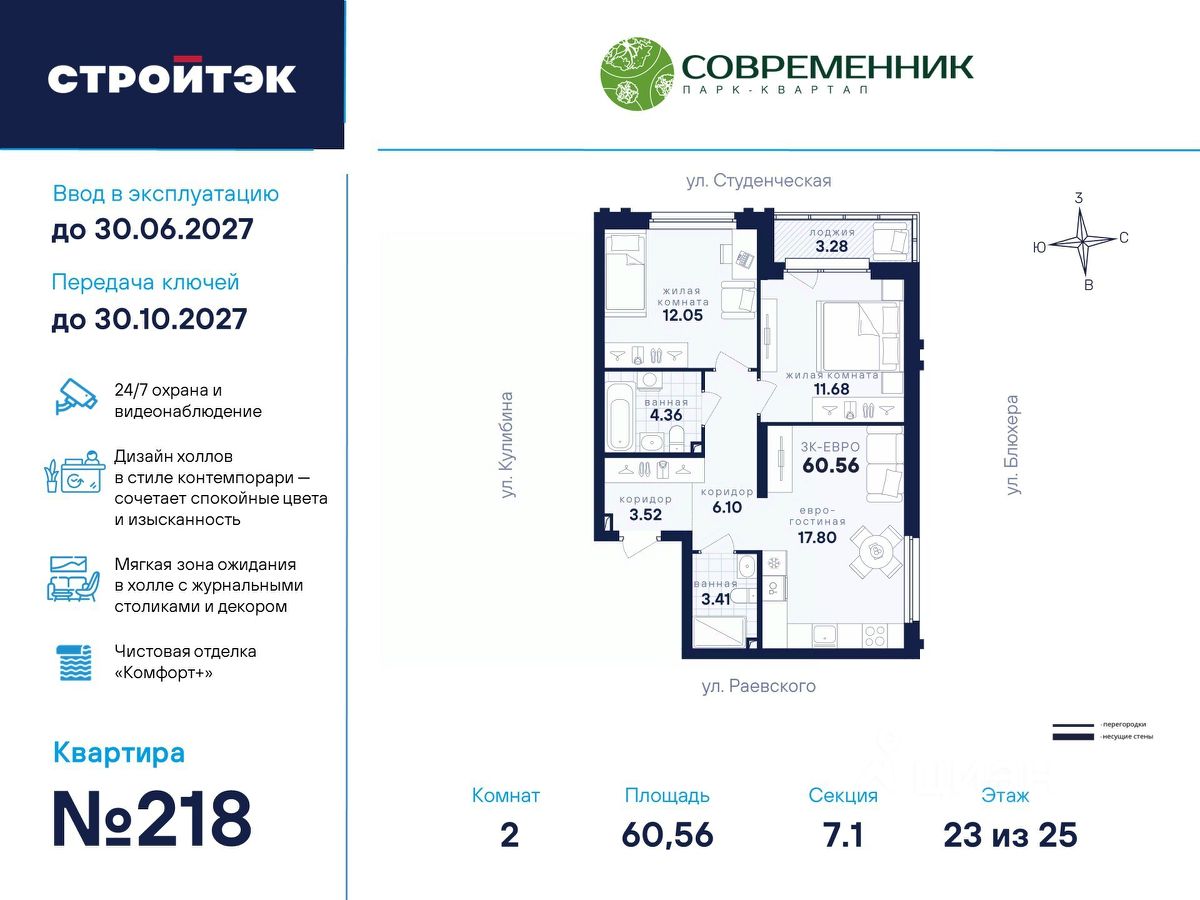 Время жить счастливо Современник — знаковый парк-квартал в интеллигентном районе Втузгородок, откуда недалеко до центра, а вблизи ведущие вузы и театры. Квартал состоит из 8 очередей строительства. Шесть очередей уже сданы и заселены, седьмая строится. В продаже квартиры от застройщика: 1 этап седьмой очереди. Объединяет квартал большой внутренний парк площадью в гектар — богатый прогулочными маршрутами, тенистыми деревьями, пространствами для отдыха, спорта и детских игр. С внешней стороны, у домов седьмой очереди, появится гостевой центр. Проект создавали в KCAP Architects and Planners, архитектурном бюро из Нидерландов, чьи работы украшают ландшафты Гамбурга, Антверпена и других городов Европы. Технологии, продуманное пространство и трендовый облик зданий создают размеренную атмосферу для жизни здесь. Достойное окружение До проспекта Ленина на машине вы доберётесь за 10 минут, а с другой стороны, неподалёку — Шарташский лесопарк с озером Шарташ, которому около миллиона лет. Здесь для вас пляжи, лодочные станции, тропы для бега и кафе. В квартале уже работают супермаркеты, пекарни, салон красоты и не только. Ближние школы, гимназии и университеты помогут расправить крылья новым поколениям, а детские сады станут заботливой средой в начале пути. Кстати, на территории квартала спроектирован муниципальный детский сад на 200 мест. Выходите во двор Гуляйте по зелёным аллеям или устройтесь с книгой в гамаке. Займитесь воркаутом, футболом, баскетболом или пинг-понгом. Проводите семейные праздники под крытым амфитеатром или отправьте детей играть на насыщенный плейхаб. Мы всё предусмотрели. На закрытой территории без машин и посторонних спокойно и безопасно. Видеонаблюдение и освещение добавляют ещё больше уверенности. Впечатляющая доминанта у домов 7 очереди — новый гостевой центр: камерное пространство под навесом-перголой с озеленением и скамейками, чтобы встречать друзей. Ваша зона комфорта Стильное лобби Современника мы выполним в эстетике contemporary: минимализм, сочетание дерева со штукатуркой и тёмным металлом, зеркала, витражи. Обстановка из мягкой мебели, растений и книг. Двери из холла выходят на обе стороны. Внутри — комната для колясок и самокатов. На -1 этаже подземный паркинг с 201 машино-местом, куда легко попасть на лифте прямо с вашего этажа. Здесь же можно приобрести одну из 67 кладовых, чтобы хранить сезонный инвентарь. СТРОЙТЭК возводит 7 очередь в 3 этапа. Дом с привилегиями Первый этап — секция 7.1, башня в 25 этажей. Здесь 246 квартир в 19 уникальных планировках от студий до 3-комнатных, в классических и евро-вариантах. Просторные кухни-гостиные, гардеробные и окна на 2 стороны — лишь часть их плюсов. В Современнике улучшенный стандарт отделки ''Комфорт +''. Помимо комфортных сантехники и электрики, в него входят оконные стёкла Energy Light, которые помогают сохранять температуру, прочный ламинат 33 класса и устойчивые к многократной покраске виниловые обои. Белые межкомнатные двери и плинтусы подчеркнут любую цветовую гамму.