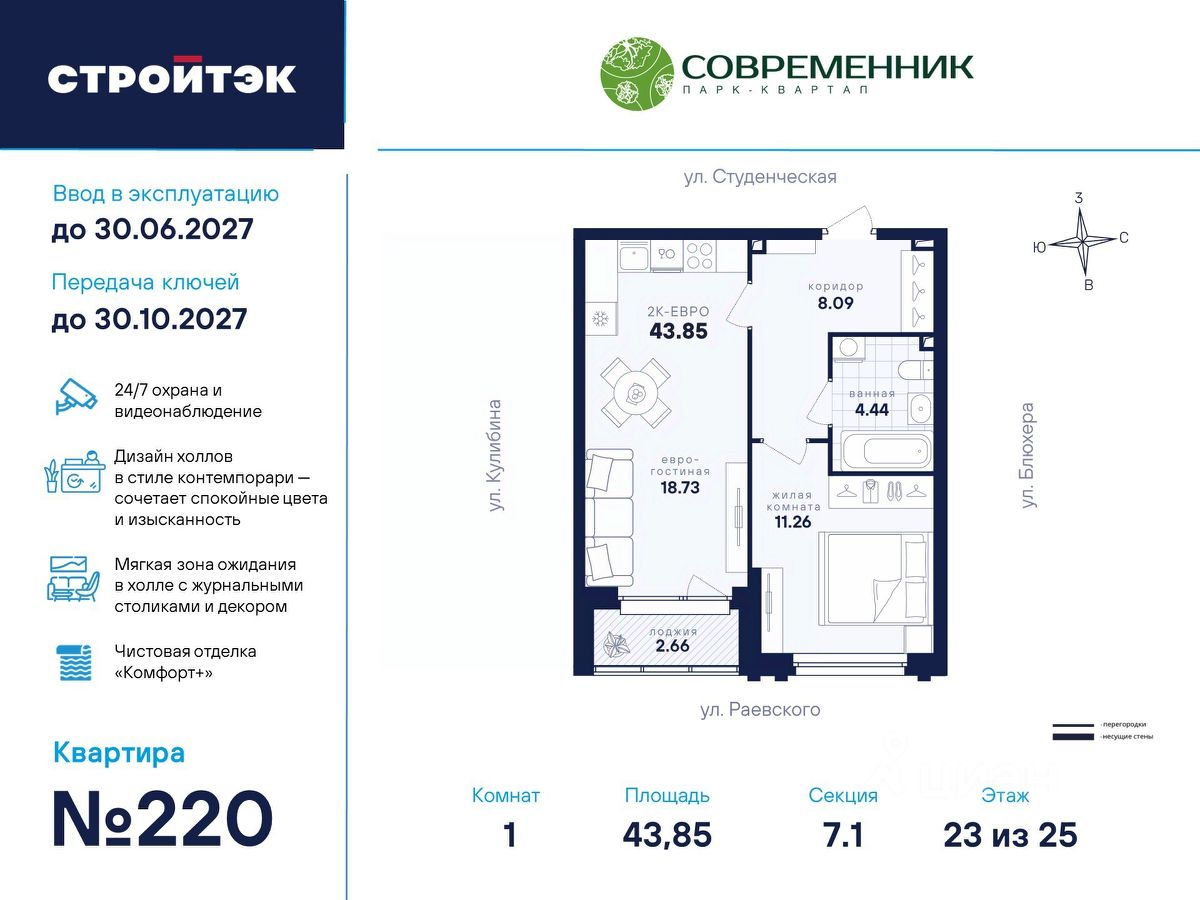 Время жить счастливо Современник — знаковый парк-квартал в интеллигентном районе Втузгородок, откуда недалеко до центра, а вблизи ведущие вузы и театры. Квартал состоит из 8 очередей строительства. Шесть очередей уже сданы и заселены, седьмая строится. В продаже квартиры от застройщика: 1 этап седьмой очереди. Объединяет квартал большой внутренний парк площадью в гектар — богатый прогулочными маршрутами, тенистыми деревьями, пространствами для отдыха, спорта и детских игр. С внешней стороны, у домов седьмой очереди, появится гостевой центр. Проект создавали в KCAP Architects and Planners, архитектурном бюро из Нидерландов, чьи работы украшают ландшафты Гамбурга, Антверпена и других городов Европы. Технологии, продуманное пространство и трендовый облик зданий создают размеренную атмосферу для жизни здесь. Достойное окружение До проспекта Ленина на машине вы доберётесь за 10 минут, а с другой стороны, неподалёку — Шарташский лесопарк с озером Шарташ, которому около миллиона лет. Здесь для вас пляжи, лодочные станции, тропы для бега и кафе. В квартале уже работают супермаркеты, пекарни, салон красоты и не только. Ближние школы, гимназии и университеты помогут расправить крылья новым поколениям, а детские сады станут заботливой средой в начале пути. Кстати, на территории квартала спроектирован муниципальный детский сад на 200 мест. Выходите во двор Гуляйте по зелёным аллеям или устройтесь с книгой в гамаке. Займитесь воркаутом, футболом, баскетболом или пинг-понгом. Проводите семейные праздники под крытым амфитеатром или отправьте детей играть на насыщенный плейхаб. Мы всё предусмотрели. На закрытой территории без машин и посторонних спокойно и безопасно. Видеонаблюдение и освещение добавляют ещё больше уверенности. Впечатляющая доминанта у домов 7 очереди — новый гостевой центр: камерное пространство под навесом-перголой с озеленением и скамейками, чтобы встречать друзей. Ваша зона комфорта Стильное лобби Современника мы выполним в эстетике contemporary: минимализм, сочетание дерева со штукатуркой и тёмным металлом, зеркала, витражи. Обстановка из мягкой мебели, растений и книг. Двери из холла выходят на обе стороны. Внутри — комната для колясок и самокатов. На -1 этаже подземный паркинг с 201 машино-местом, куда легко попасть на лифте прямо с вашего этажа. Здесь же можно приобрести одну из 67 кладовых, чтобы хранить сезонный инвентарь. СТРОЙТЭК возводит 7 очередь в 3 этапа. Дом с привилегиями Первый этап — секция 7.1, башня в 25 этажей. Здесь 246 квартир в 19 уникальных планировках от студий до 3-комнатных, в классических и евро-вариантах. Просторные кухни-гостиные, гардеробные и окна на 2 стороны — лишь часть их плюсов. В Современнике улучшенный стандарт отделки ''Комфорт +''. Помимо комфортных сантехники и электрики, в него входят оконные стёкла Energy Light, которые помогают сохранять температуру, прочный ламинат 33 класса и устойчивые к многократной покраске виниловые обои. Белые межкомнатные двери и плинтусы подчеркнут любую цветовую гамму.