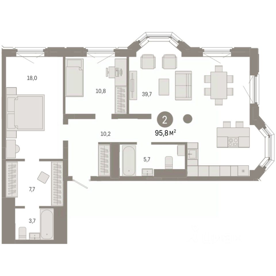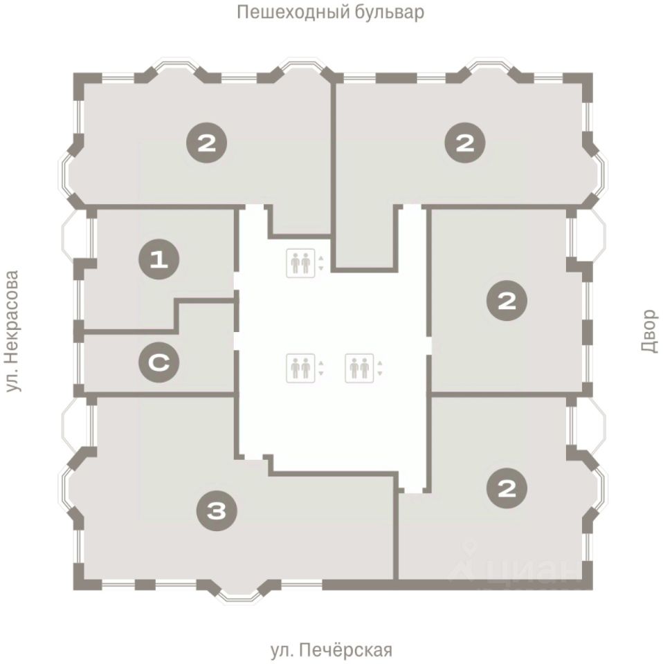 Квартира с кухней-гостиной и двумя спальнями в квартале ''На Некрасова''. Особенности планировки: предчистовая отделка. квартиры в нашей базе: НКР02-Ж1.8.5.