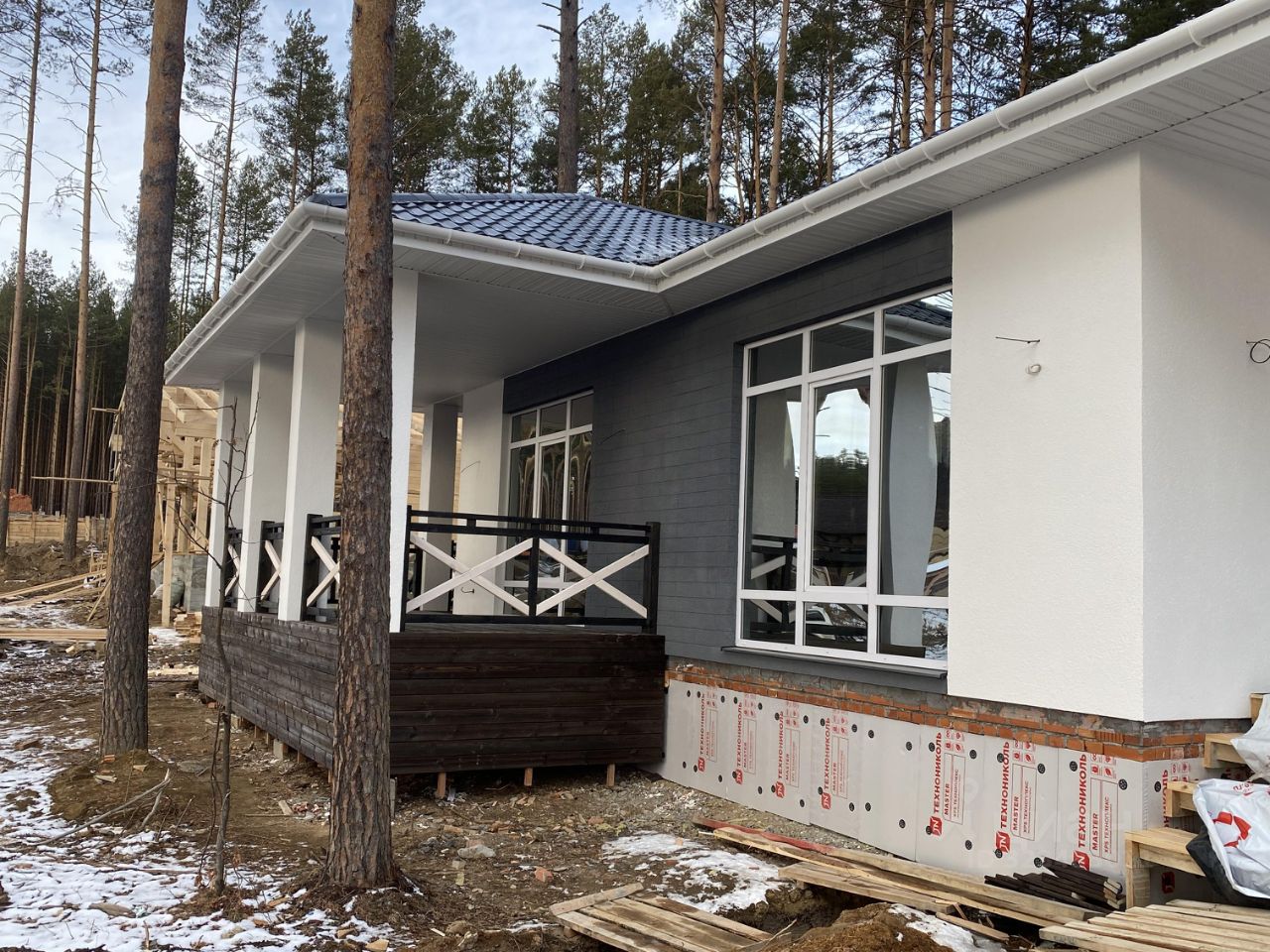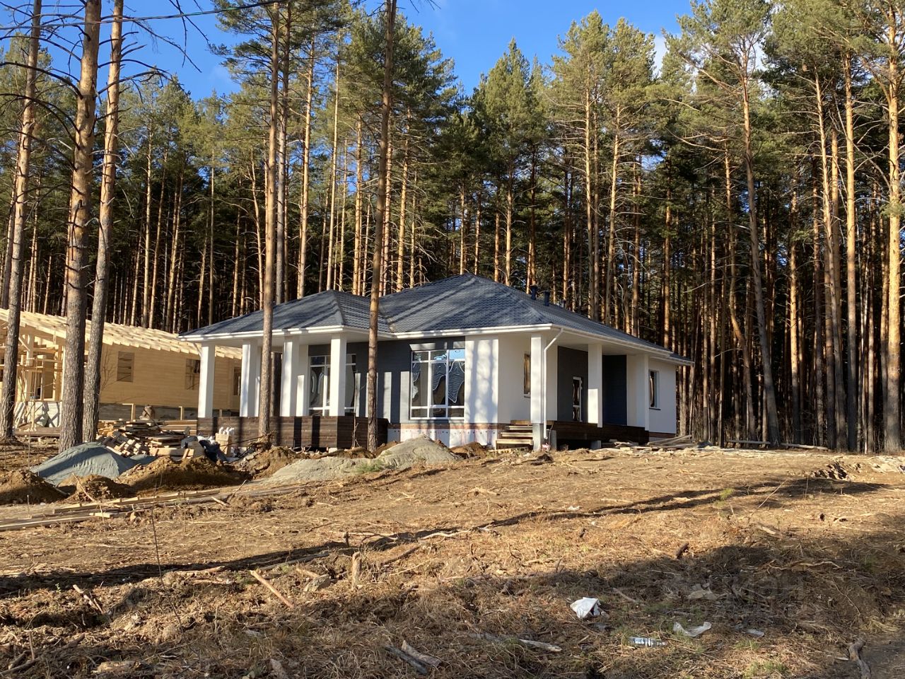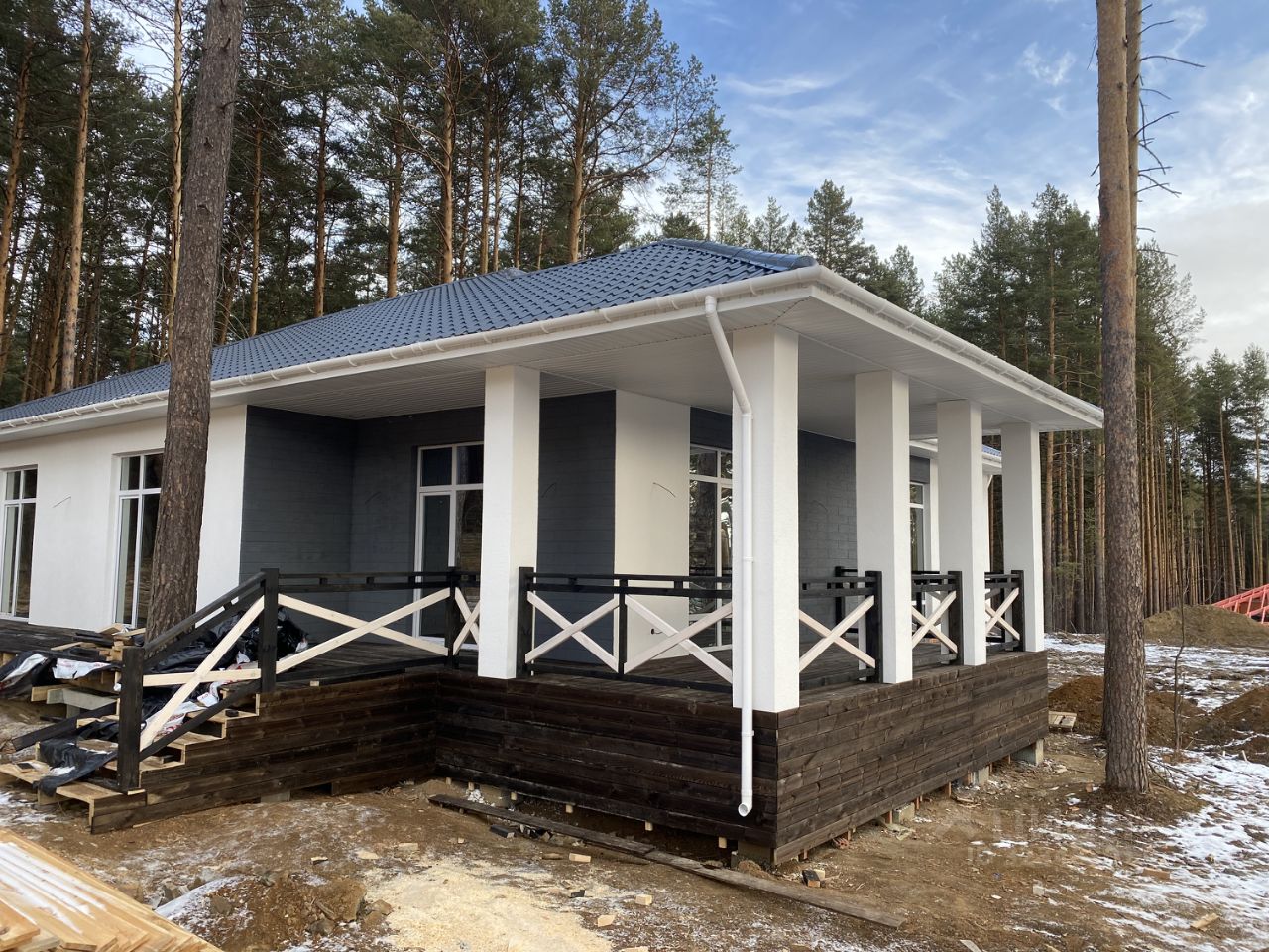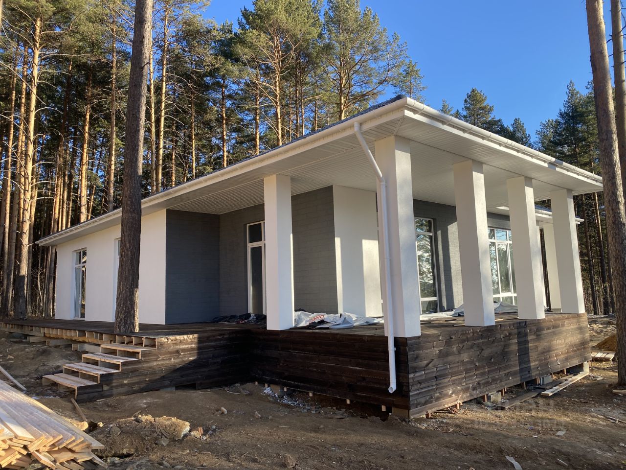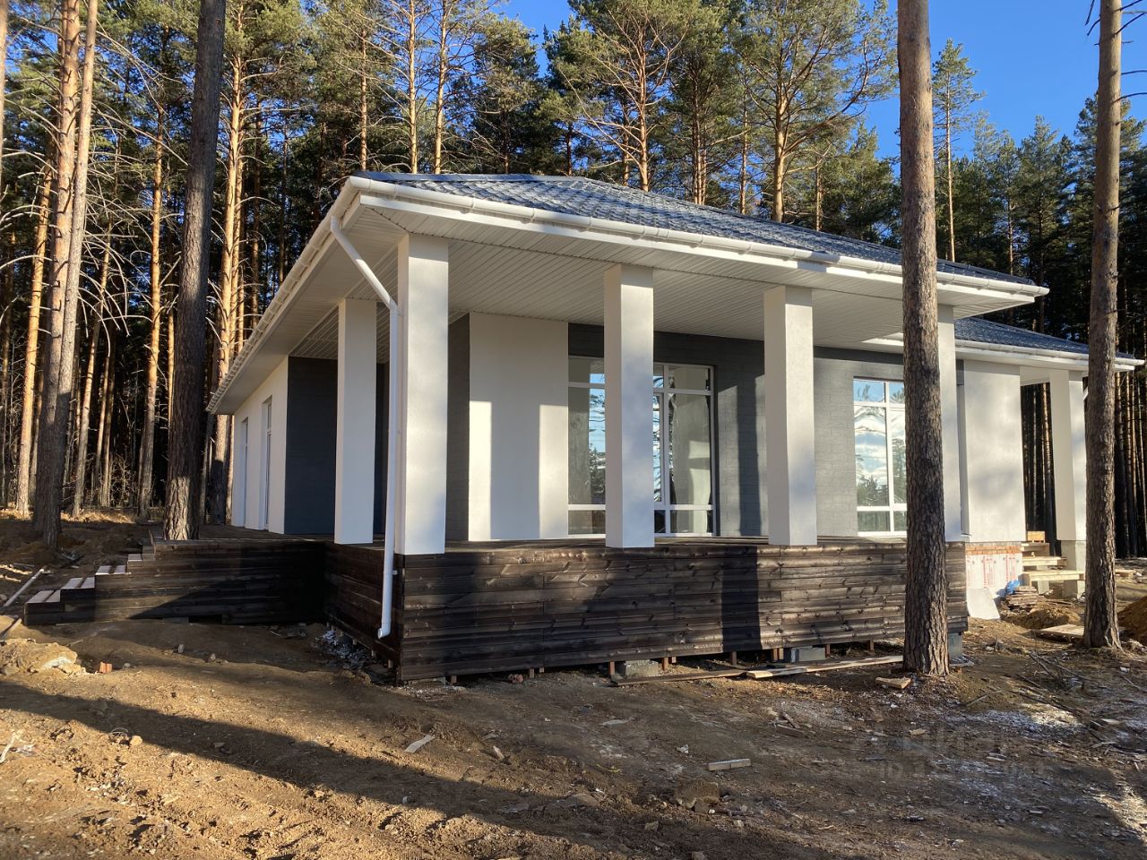 Дом расположен на улице в окружении вековых сосен.