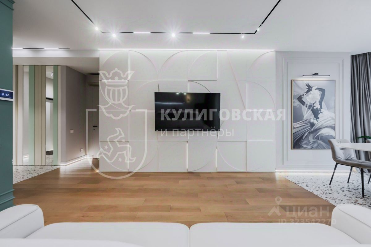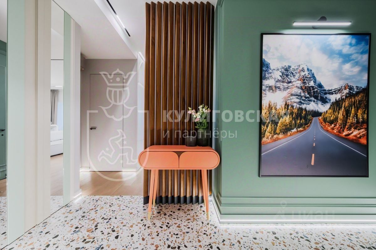О квартире: — Площадь и планировка: просторная гостиная, отдельная кухня, две спальни, гардеробная и два санузла. — Дизайн-проект премиум-класса: терраццо, натуральное дерево, глубокие изумрудные акценты и авторские декоративные панели. — Гостиная с панорамными окнами и художественным освещением — место, где искусство становится частью интерьера.