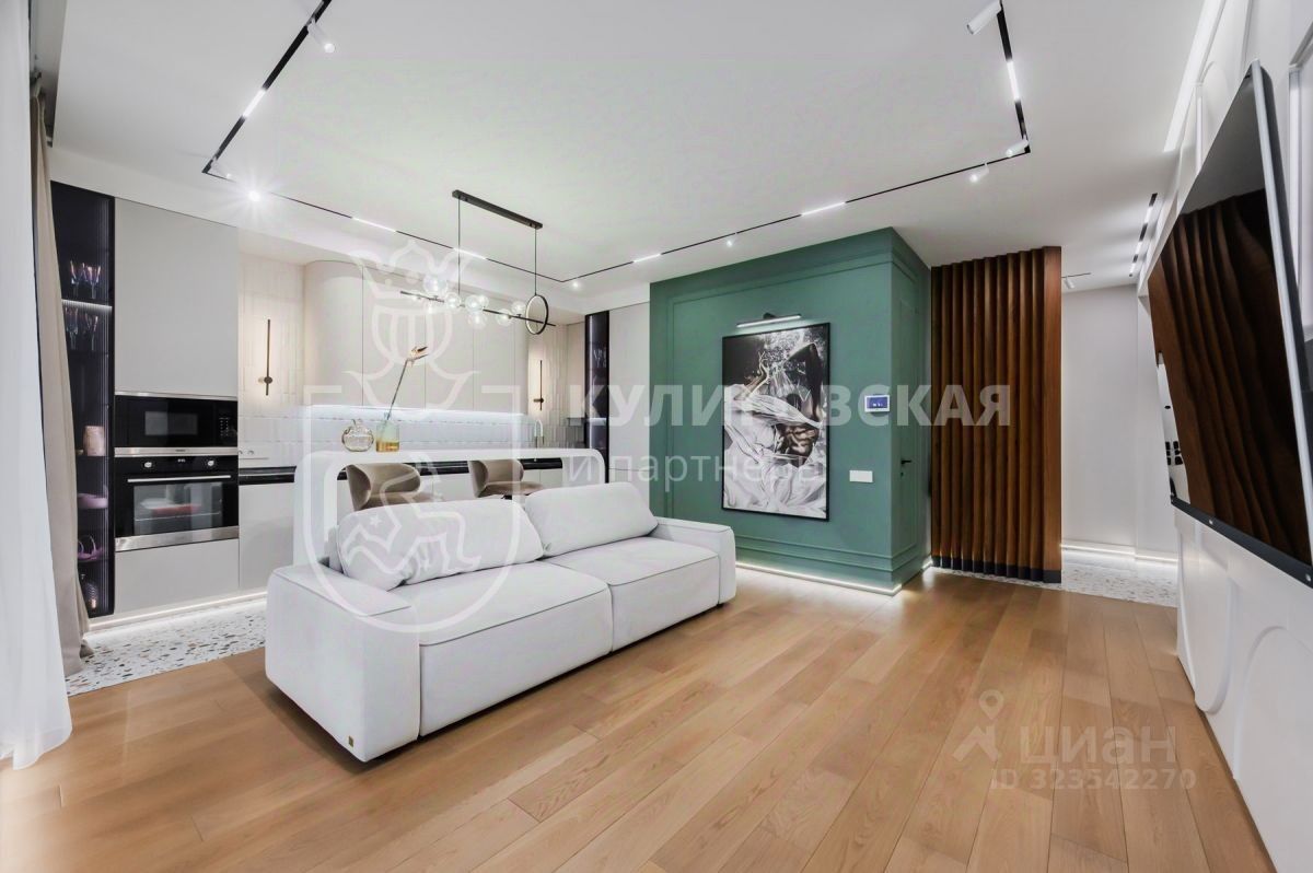 О квартире: — Площадь и планировка: просторная гостиная, отдельная кухня, две спальни, гардеробная и два санузла. — Дизайн-проект премиум-класса: терраццо, натуральное дерево, глубокие изумрудные акценты и авторские декоративные панели. — Гостиная с панорамными окнами и художественным освещением — место, где искусство становится частью интерьера. — Кухня мечты: лаконичная, полностью оборудованная встроенной техникой, с барной стойкой и уютной зоной для завтраков. — Мастер-спальня — с мягким освещением и продуманной системой хранения. — Качественная инженерия: тёплые полы, климат-контроль, дизайнерский свет, многоуровневая подсветка. — Вся мебель — на заказ, с безупречной эргономикой и эстетикой.