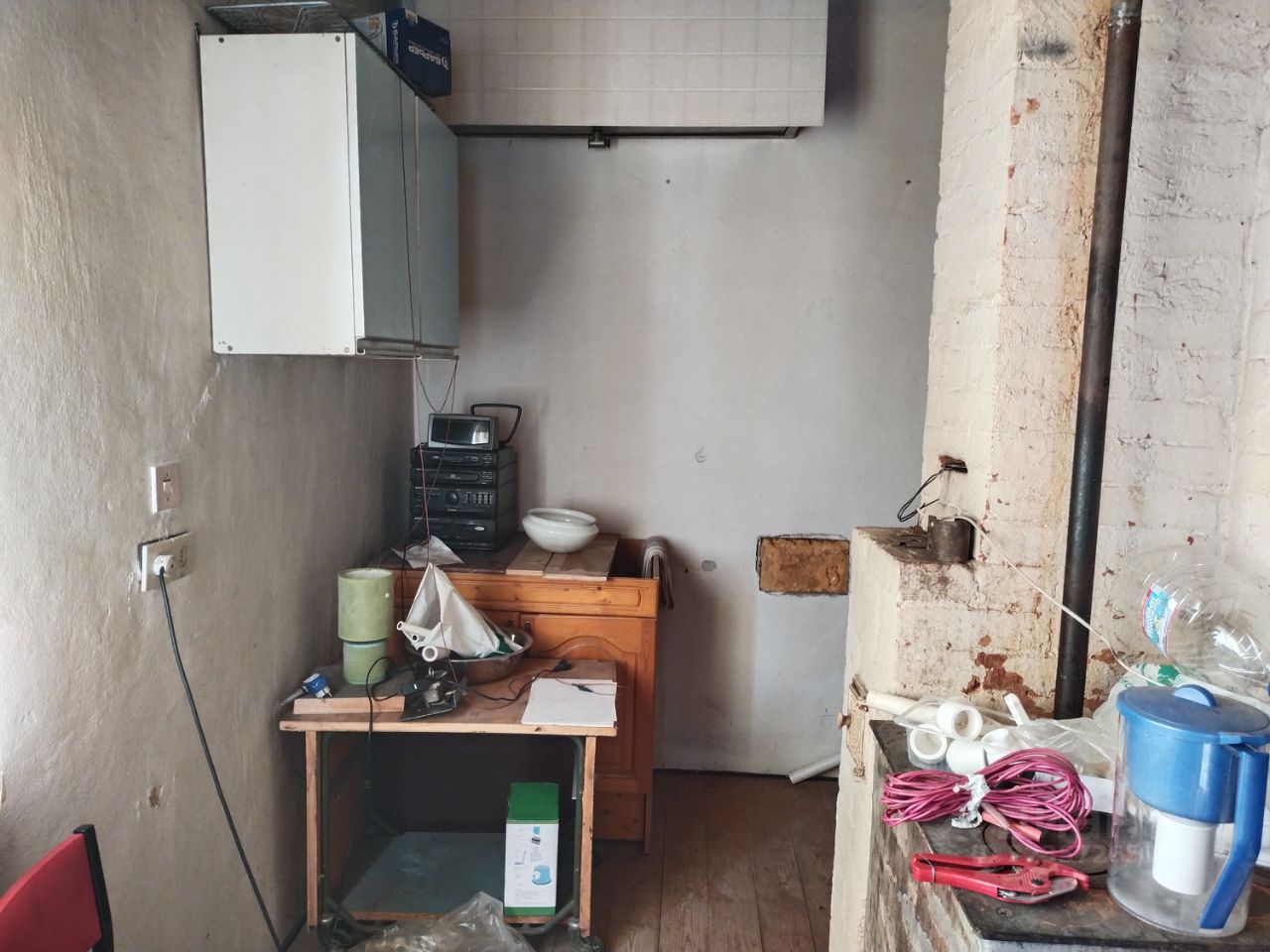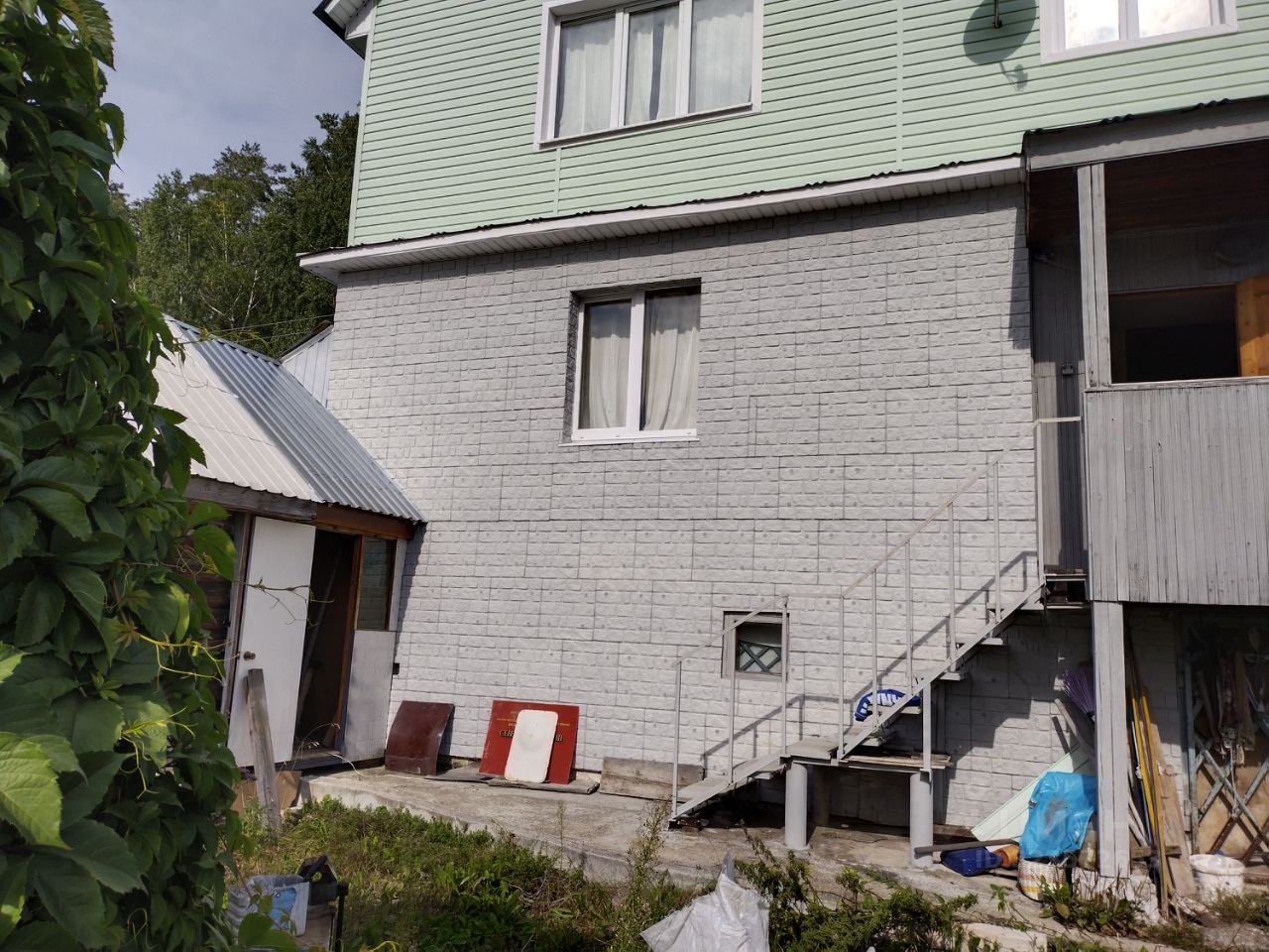 Участок 2 (733 м²) с постройками: Дом 6х8: • Двухэтажный: 1 этаж - кирпич с облицовкой, 2 этаж - брус со сайдингом • Цокольный этаж с гаражом и смотровой ямой • Установлен водяной котел и камин • Требуется ремонт и проведение коммуникаций