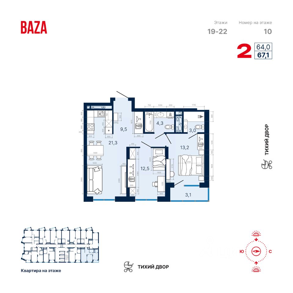 Продаётся квартира в Квартал-парк ''Каменные палатки'' от застройщика BAZA Development (покупка квартиры защищена банком). 2-комнатная квартира, 67,11 м², 214, 4 очередь, 13 секция. Стоимость указана с учетом отделки white box.