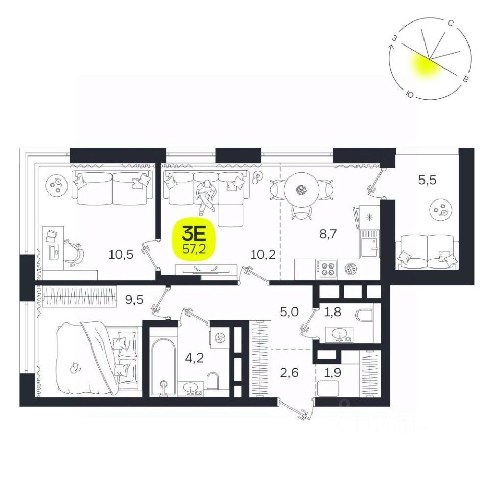 Общая площадь57,2 м2