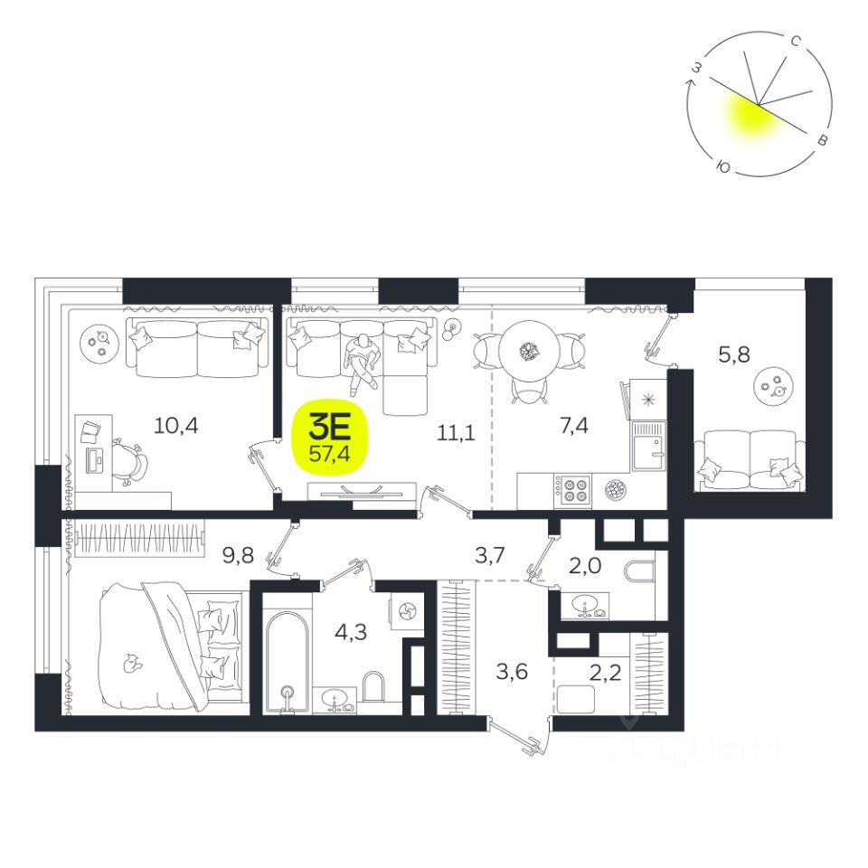 Общая площадь57,4 м2