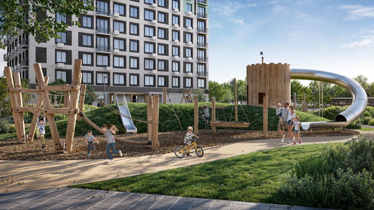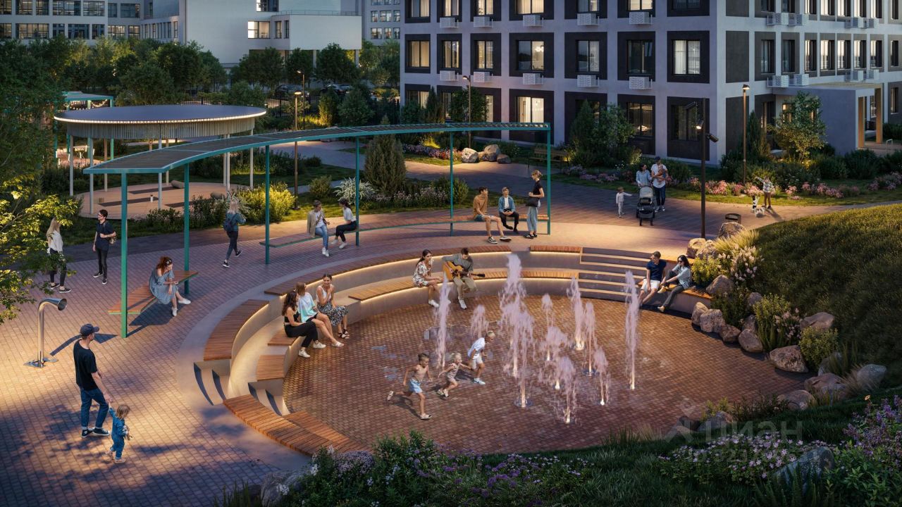 Благоустроенные дворы. Наполнение двора детально продумано, с учетом потребностей каждого жителя. Детские площадки для разных возрастов, зоны отдыха, зеленые аллеи и пешеходные дорожки. В центре двора предусмотрен амфитеатр для общих встреч жителей и больших мероприятий. Собственная сервисная компания 24/7 поддерживает чистоту территории жилого квартала.